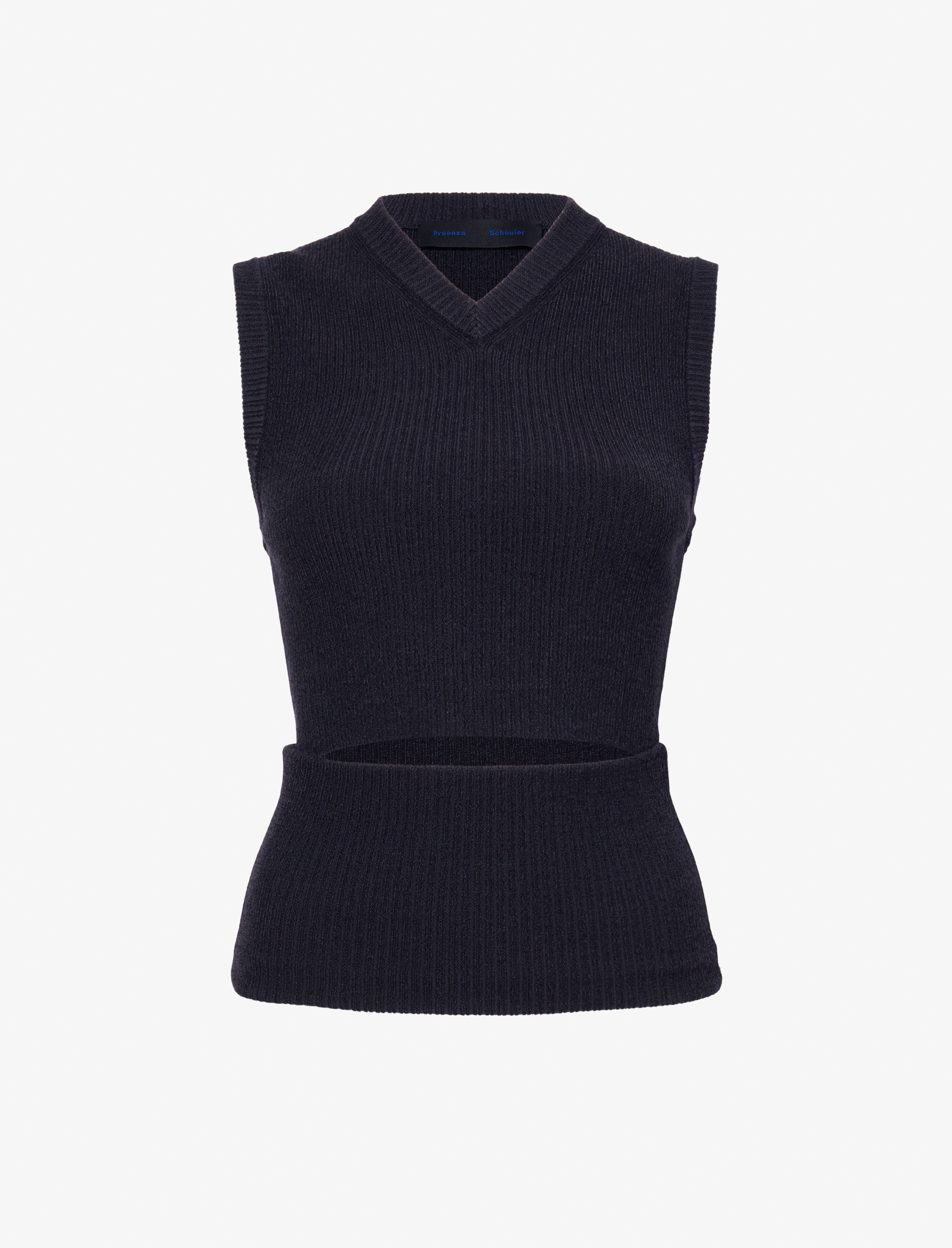 Fall 2024 Runway Collection | Look 4 The Cruz Vest in Midweight Viscose Rib features a sleeveless silhouette with a small abdomen cut-out. Designed to wear in multiple ways, this style is detailed in the back with a button placket that can be unclasped to fully detach the lower portion of the top. Wear this top layered high to conceal the front opening, pulled down to expose the cut-out, or with the bottom portion removed for a cropped finish. When removed, the bottom portion can be worn as a tube scarf. Details - Charcoal - Rib knit - Shallow V-neck - Sleeveless - Front cut-out detail - Back button placket - Fully detachable bottom portion - Slim fit - 55% viscose, 37% wool, 8% polyester - SKU: R2447196KY326010 Size & Fit - Model is 5'11'' with 28.5'' bust / 34.5'' hips. Wearing size Small Care - 55% viscose, 37% wool, 8% polyester - Dry clean only