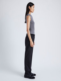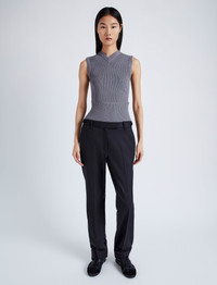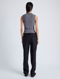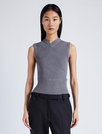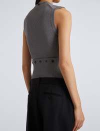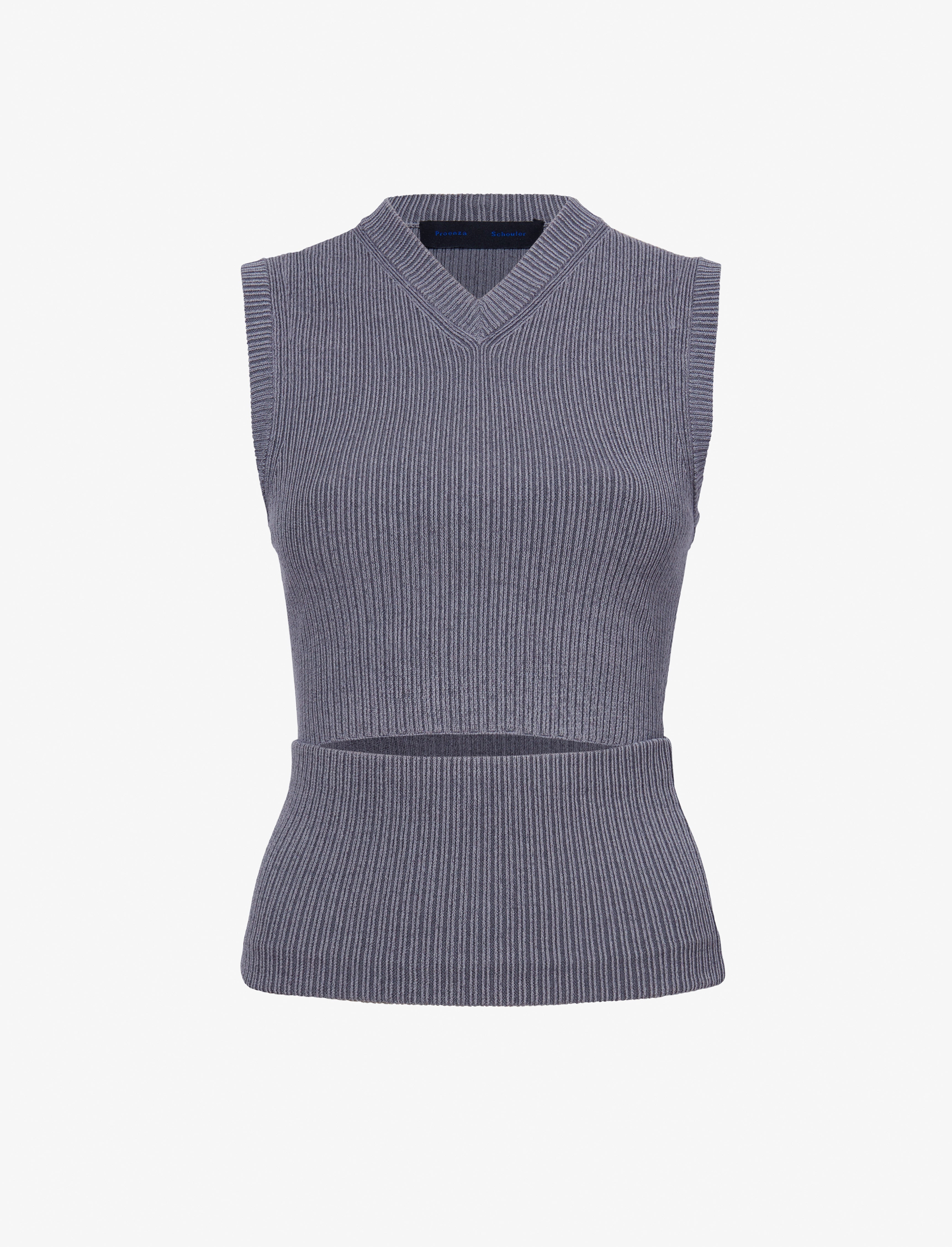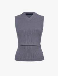 The Cruz Vest in Midweight Viscose Rib features a sleeveless silhouette with a small abdomen cut-out. Designed to wear in multiple ways, this style is detailed in the back with a button placket that can be unclasped to fully detach the lower portion of the top. Wear this top layered high to conceal the front opening, pulled down to expose the cut-out, or with the bottom portion removed for a cropped finish. When removed, the bottom portion can be worn as a tube scarf. Details - Grey - Rib knit - Shallow V-neck - Sleeveless - Front cut-out detail - Back button placket - Fully detachable bottom portion - Slim fit - 55% viscose, 37% wool, 8% polyester - SKU: R2447196KY326011 Size & Fit - Model is 5'11'' with 28.5'' bust / 34.5'' hips. Wearing size Small Care - 55% viscose, 37% wool, 8% polyester - Dry clean only