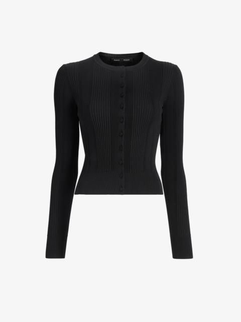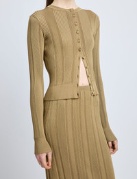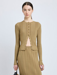 The Currin Top in Column Rib is knitted to a slim cardigan silhouette. Detailed with ribbed trims and self-covered buttons. Details - Bronze - Crew neckline - Long sleeves - Button front fastening - Self-covered buttons - Ribbed trims - Straight hem - Slim fit - SKU: R2537245KY353220 Size & Fit - Model is 5'11'' with 30'' bust / 35.5'' hips. Wearing size Small
