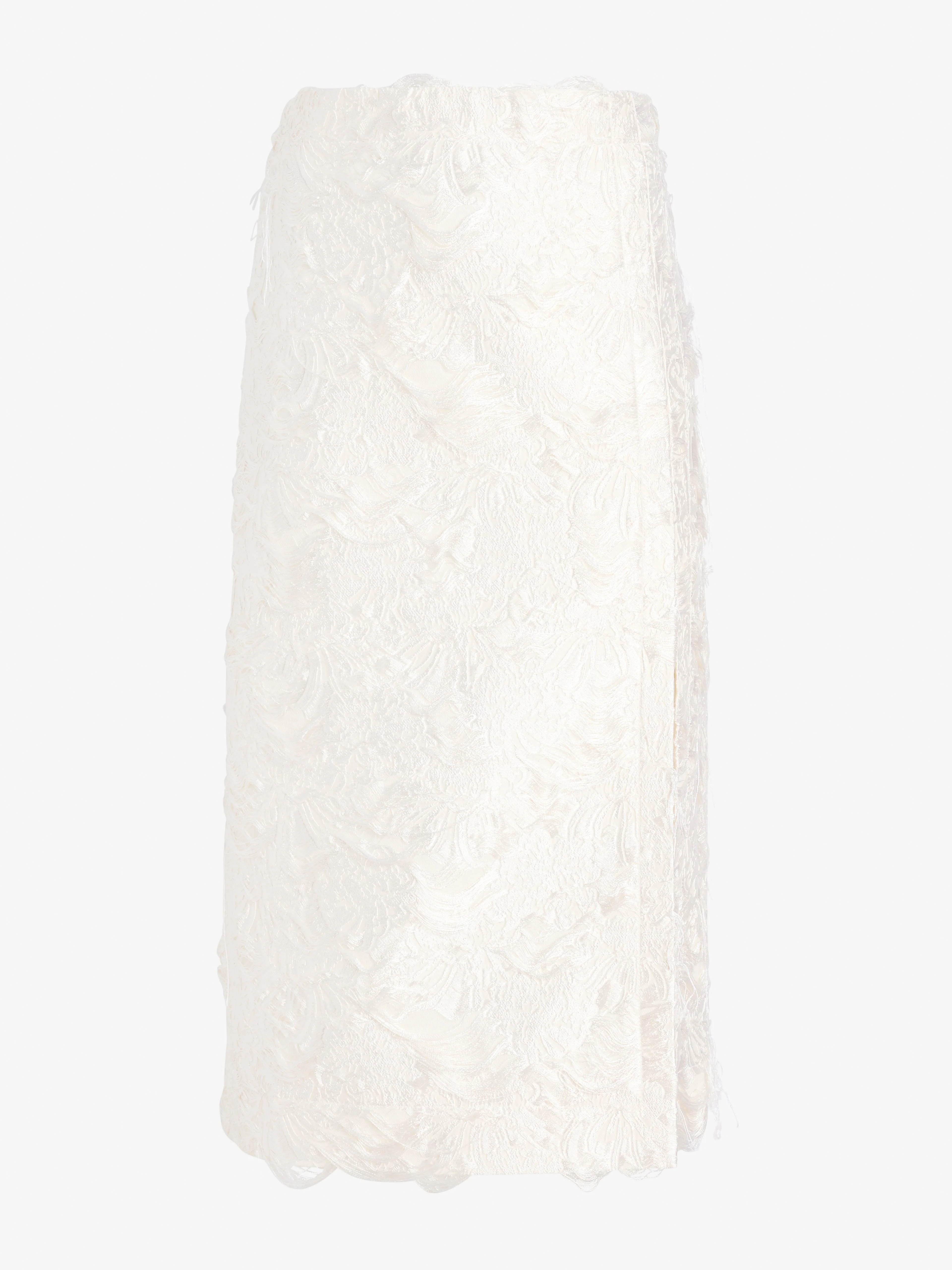 The Dalma Skirt in Chrysanthemum Float Jacquard features a straight, calf- length silhouette with a front side slit, crafted in textured jacquard adorned with a delicate chrysanthemum motif. Details - Off white multi - Chrysanthemum jacquard - Front slit - Slim fit - Frayed edge hem - 71% Viscose, 13% Silk, 10% Polyester, 5% Polyamide, 1% Elastane - SKU: R2625003AY216120 Size & Fit - Model is 5'11'' with 30.5'' bust / 34.5'' hips. Wearing size 4 Care - 71% viscose, 13% silk, 10% polyester, 5% polyamide, 1% elastane - Dry clean only