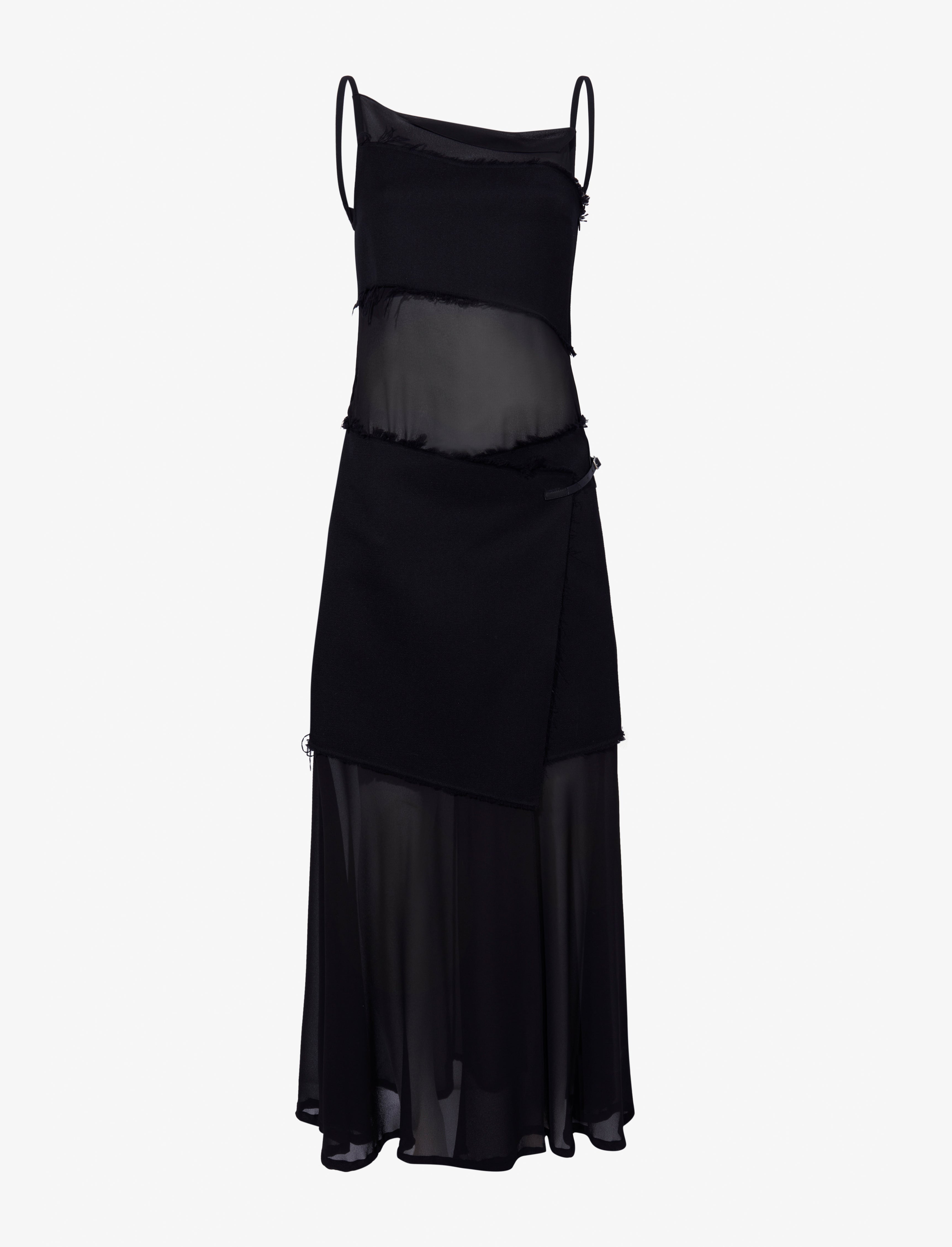 Fall 2024 Runway Collection | Look 34 The Dani Dress in Chiffon features an A-line silhouette with an asymmetric neckline contrasted by layers of opaque paneling. Completed with a custom leather belt, frayed panel edging, and small hem chain to aid in movement. Details - Black - Asymmetric neck - Thin shoulder straps - Wool gabardine panels - Frayed panel edges - Tuck at front bodice - Custom leather belt - Zipper closure - Hem chain to keep movement - Sheer base layer: 100% polyester; Panels: 56% polyamide, 44% wool / 70% triacetate, 30% polyester - Made in Poland - SKU: R2443014BY279001 Size & Fit - Model is 5'10'' with 31.5'' bust / 34'' hips. Wearing size 4 Care - Sheer base layer: 100% polyester; Panels: 56% polyamide, 44% wool / 70% triacetate, 30% polyester - Dry clean only