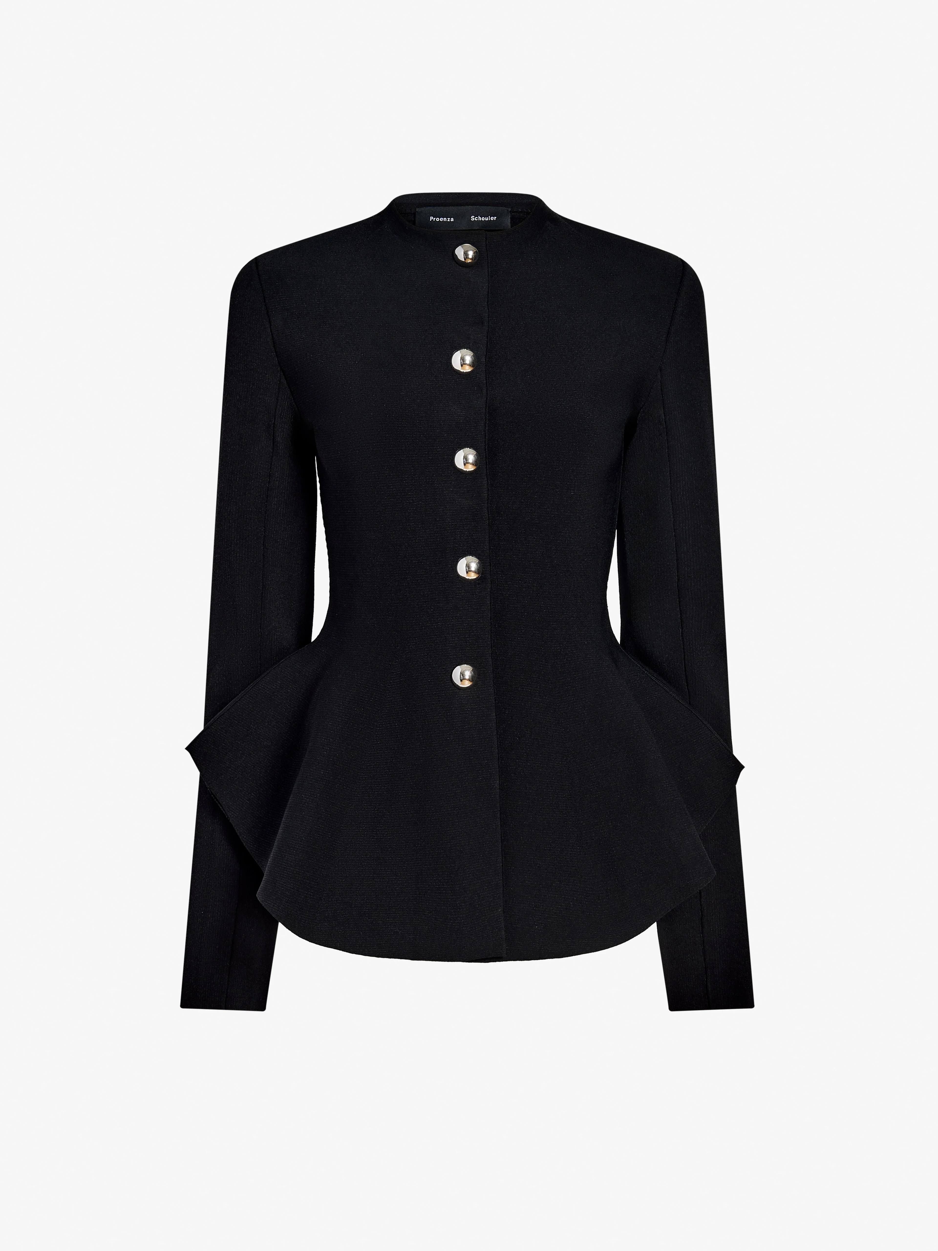 The Dasha Jacket in Compact Viscose is sculpted to a peplum silhouette with an accentuated flounce. Finished with silver dome front button fastenings. Details - Black - High neckline - Long sleeves - Silver dome button fastenings - Accentuated flounce at waist - Peplum silhouette - 62% viscose, 36% polyamide, 2% lycra - SKU: R2617316KY412001 Size & Fit - Model is 5'10'' with 32'' bust / 34'' hips. Wearing size Small Care - 62% viscose, 36% polyamide, 2% lycra - Dry clean only