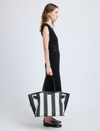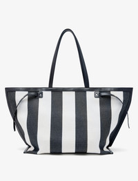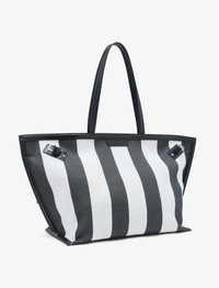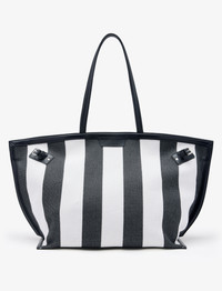 The Days Carryall in Striped Canvas is crafted with two-tone jacquard detailing. Designed in a large carry-all silhouette, it features functional silver-tone side buckles that allow the corners of the bag to be folded inwards or worn loose for a relaxed finish. The tote has a magnetic top closure with an internal monogrammed zip pocket and two patch small patch pockets. Finished with a leather base panel and an exterior embossed logo. Details - Black, white - Striped canvas - Carry-all silhouette - Two handles - Magnetic top closure - Side buckle details - Embossed logo - Zip pocket - Patch pockets - Silver-tone hardware - Bombay edges - Leather base panel - Bag/accents: 42% cotton, 38% viscose, 20% calfskin - SKU: HB253094X505S965 Size & Fit - W: 59cm x H: 29.5cm x D: 22cm - Shoulder Drop Length: 27cm Care - Bag/accents: 42% cotton, 38% viscose, 20% calfskin - Our bags are hand crafted using genuine leather. Variations in tone, marks or grain are common and should not be considered imperfections. Like all natural materials, leather reacts to the atmosphere. Humidity, rain, and sunlight can damage leather. Should a slight white coating appear on the surface of the leather, it can easily be removed using a dry cloth. Should the leather get wet, please absorb the water immediately with a dry cloth. Overexposure to sunlight can stain or alter the color of the leather.