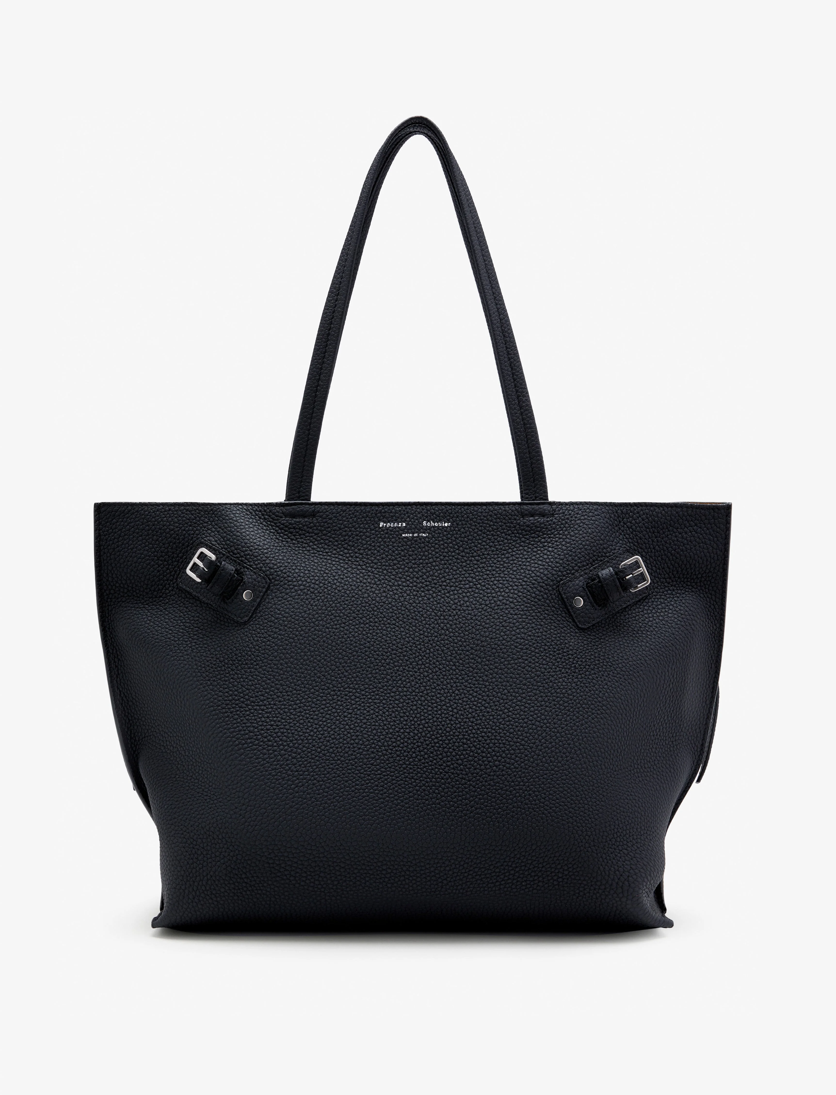 The Days Tote is crafted in pebbled calf, creating a dry matte finish. Designed in a large carry-all silhouette, it features functional silver-tone side buckles that allow the corners of the bag to be folded inwards or worn loose for a relaxed finish. The tote has a magnetic top closure with an internal monogrammed zip pocket compartment and is suede-lined with a leather base panel, finished with an exterior silver-tone logo. Details - Black - Pebbled matte finish - Carry-all silhouette - Two handles - Magnetic top closure - Side buckle details - Silver logo - Zip pocket - Silver-tone hardware - Suede lined - Leather base panel - 100% calfskin - SKU: HB251082C329S001 Size & Fit - W: 45.5cm x H: 31cm x D: 16cm - Shoulder Drop Length: 27.5cm Care - 100% calfskin - Our bags are hand crafted using genuine leather. Variations in tone, marks or grain are common and should not be considered imperfections. Like all natural materials, leather reacts to the atmosphere. Humidity, rain, and sunlight can damage leather. Should a slight white coating appear on the surface of the leather, it can easily be removed using a dry cloth. Should the leather get wet, please absorb the water immediately with a dry cloth. Overexposure to sunlight can stain or alter the color of the leather.