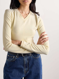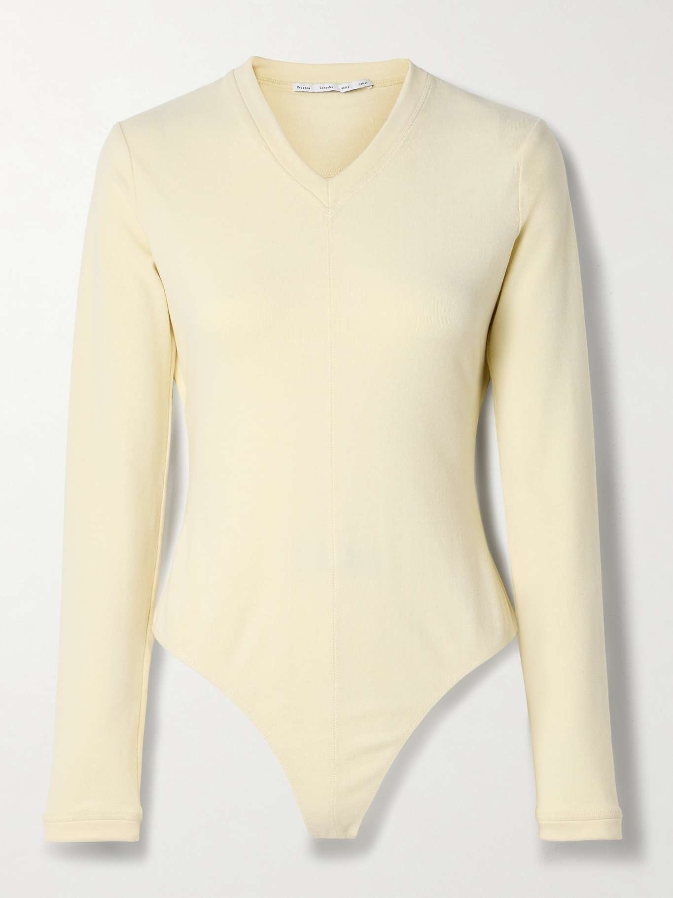 EDITORS'NOTES Proenza Schouler White Label's 'Delaney' bodysuit is made from jersey that's subtly ribbed and brushed for a soft feel. It has a high V-neckline and close fit. The pastel-yellow shade styles as effortlessly as a neutral. SIZE & FIT Model measurements: - Fits true to size, take your normal size - Designed for a close fit - Minimal brief coverage - Lightweight, stretchy fabric - Model is 180cm/ 5’11” and is wearing a size Small - Bust: 76cm/ 30" - Waist: 60cm/ 23.5" - Hip: 88cm/ 34.5" DETAILS & CARE - Pastel-yellow brushed-jersey - Snap fastenings at base - 66% rayon, 29% polyester, 5% spandex