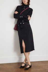 The Proenza Schouler White Label Denim Skirt will be a staple in your wardrobe. This denim skirt features a classic, straight silhouette with a front slit in a dark black wash. Wear yours with a sweater and boots. - Denim skirt - Knee length - Straight silhouette - Front slit - High rise - Minimal stretch - 99% cotton, 1% spandex