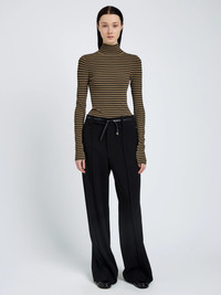 The Didi Top in Matte Viscose Velvet Stripe is knitted to a slim silhouette with a turtleneck, while alternating textural velvet stripes add subtle dimension. Details - Khaki, black - Velvet stripes - Turtleneck - Long sleeves - Contrast button closures - Straight hem - Slim silhouette - 83% viscose, 17% polyester / 65% viscose, 35% nylon - SKU: R2617295KY407287 Size & Fit - Model is 5'10.5'' with 28'' bust / 34.5'' hips. Wearing size Small Care - 83% viscose, 17% polyester / 65% viscose, 35% nylon - Dry clean only