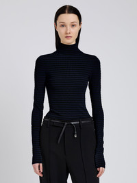 The Didi Top in Matte Viscose Velvet Stripe is knitted to a slim silhouette with a turtleneck, while alternating textural velvet stripes add subtle dimension. Details - Navy, black - Velvet stripes - Turtleneck - Long sleeves - Contrast button closures - Straight hem - Slim silhouette - 83% viscose, 17% polyester / 65% viscose, 35% nylon - SKU: R2617295KY407467 Size & Fit - Model is 5'10.5'' with 28'' bust / 34.5'' hips. Wearing size Small Care - 83% viscose, 17% polyester / 65% viscose, 35% nylon - Dry clean only