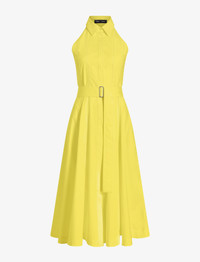 The Dorothy Dress in Eco Cotton Poplin features a high angular neck with a point collar. Detailed with eyelet trim along the bodice and includes a slider belt to accentuate the waist. Details - Yellow - High neck - Point collar - Sleeveless - Concealed front placket - Slider waist belt - Side slip pockets - Eyelet trim - Mid-length hem - Slim fit - 96% cotton, 4% elastane - SKU: R2533009SC083700 Size & Fit - Model is 5'9.5'' with 32'' bust / 34'' hips. Wearing size 4 Care - 96% cotton, 4% elastane - Dry clean only