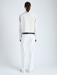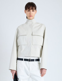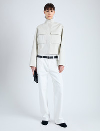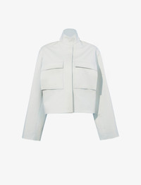 The Dylan Jacket in Organic Cotton Twill is crafted for an oversized, slightly cropped finish with drop shoulders and a high banded collar. Refined with a concealed placket and chest flap pockets. Details • Wheat • Band collar • Long sleeve • Chest flap pockets • Back neck hook detail • Fully lined • Cropped hem • Oversized finish • 97% cotton, 3% elastane • SKU: R2432006AC143272 Size & Fit • Model is 5'10'' with 32'' bust / 34'' hips. Wearing size 4 Care • 97% cotton, 3% elastane • Dry clean only