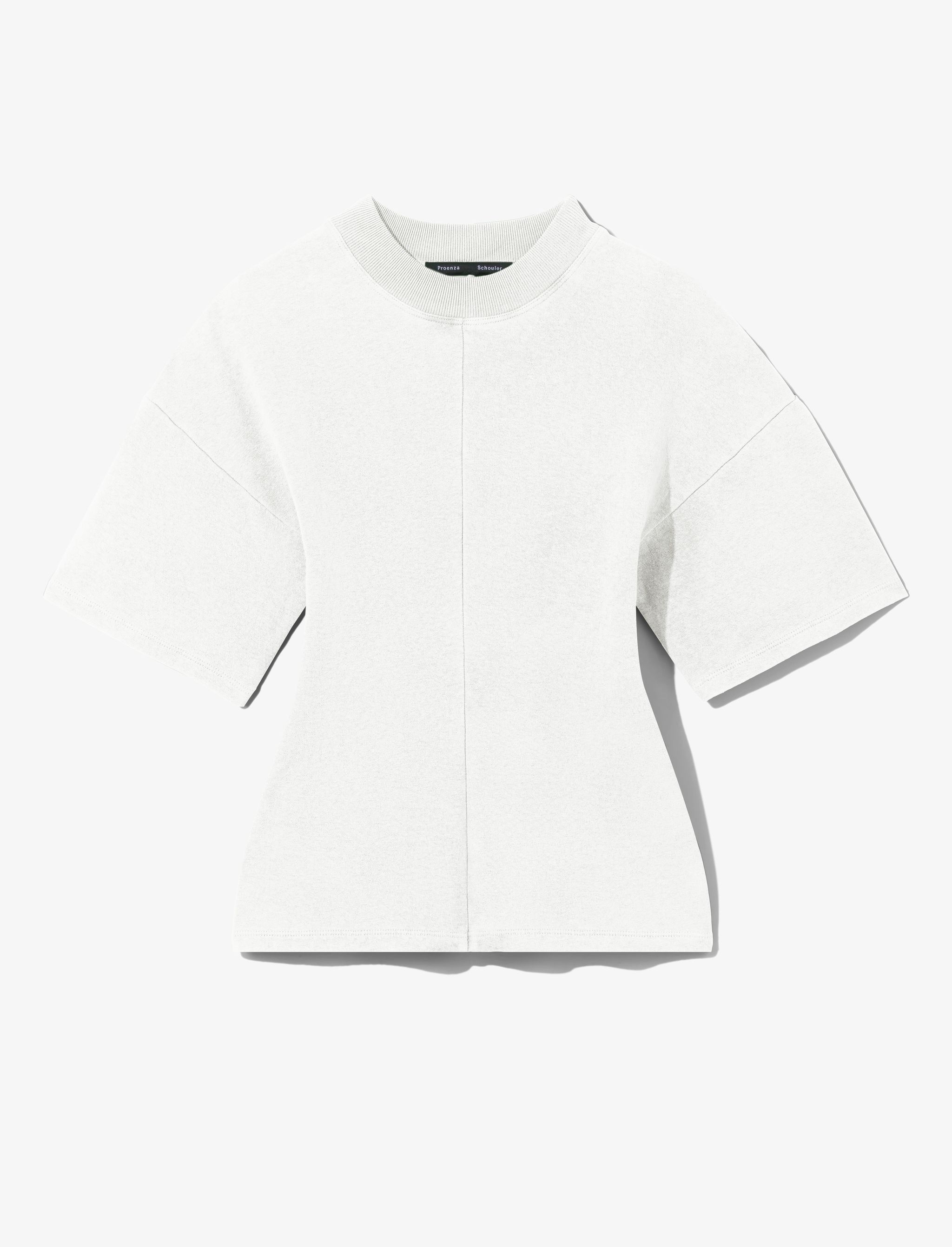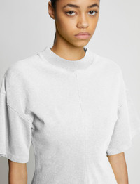The Eco Cotton T-Shirt is cut with a wide ribbed crewneck and visible seams at the front and back. Short sleeves with dropped shoulders. Features a subtly cinched waist. 93% cotton, 7% nylon. SKU: R2234010JCD146100