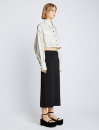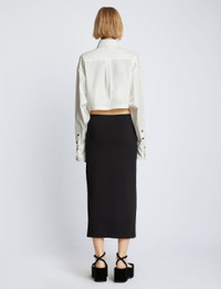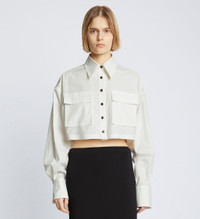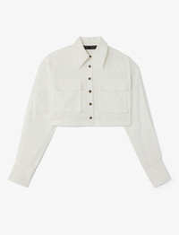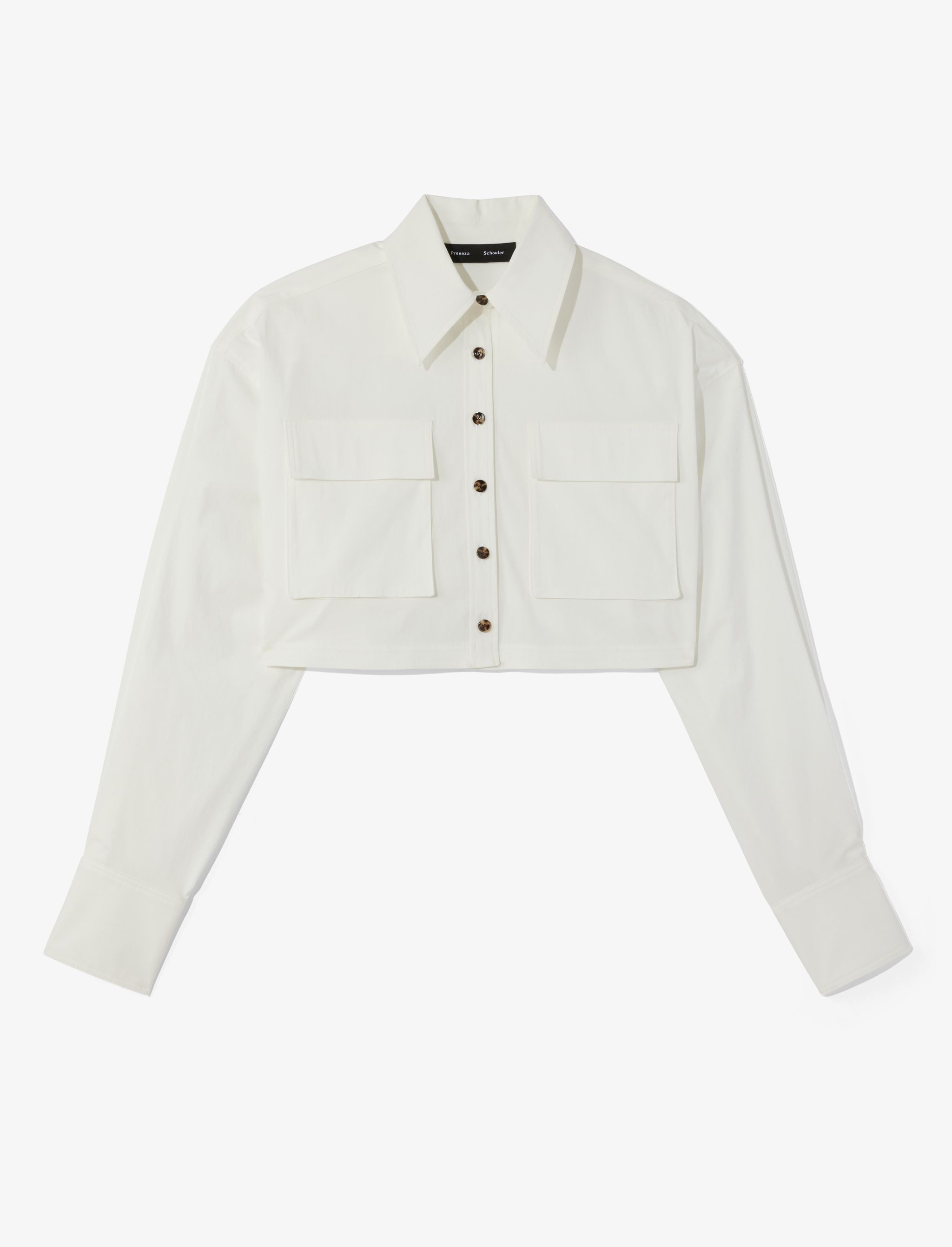 The Eco Poplin Shirt is cut from stretch cotton poplin to a boxy, cropped silhouette. Featuring drop shoulders, exaggerated flap chest pockets and long sleeves with button cuffs. White Point collar Drop shoulders Long sleeves with button cuffs Flap chest pockets Back pleat Cropped straight hem Button front fastening Relaxed fit 96% cotton, 4% elastane SKU: R2334006SC083100