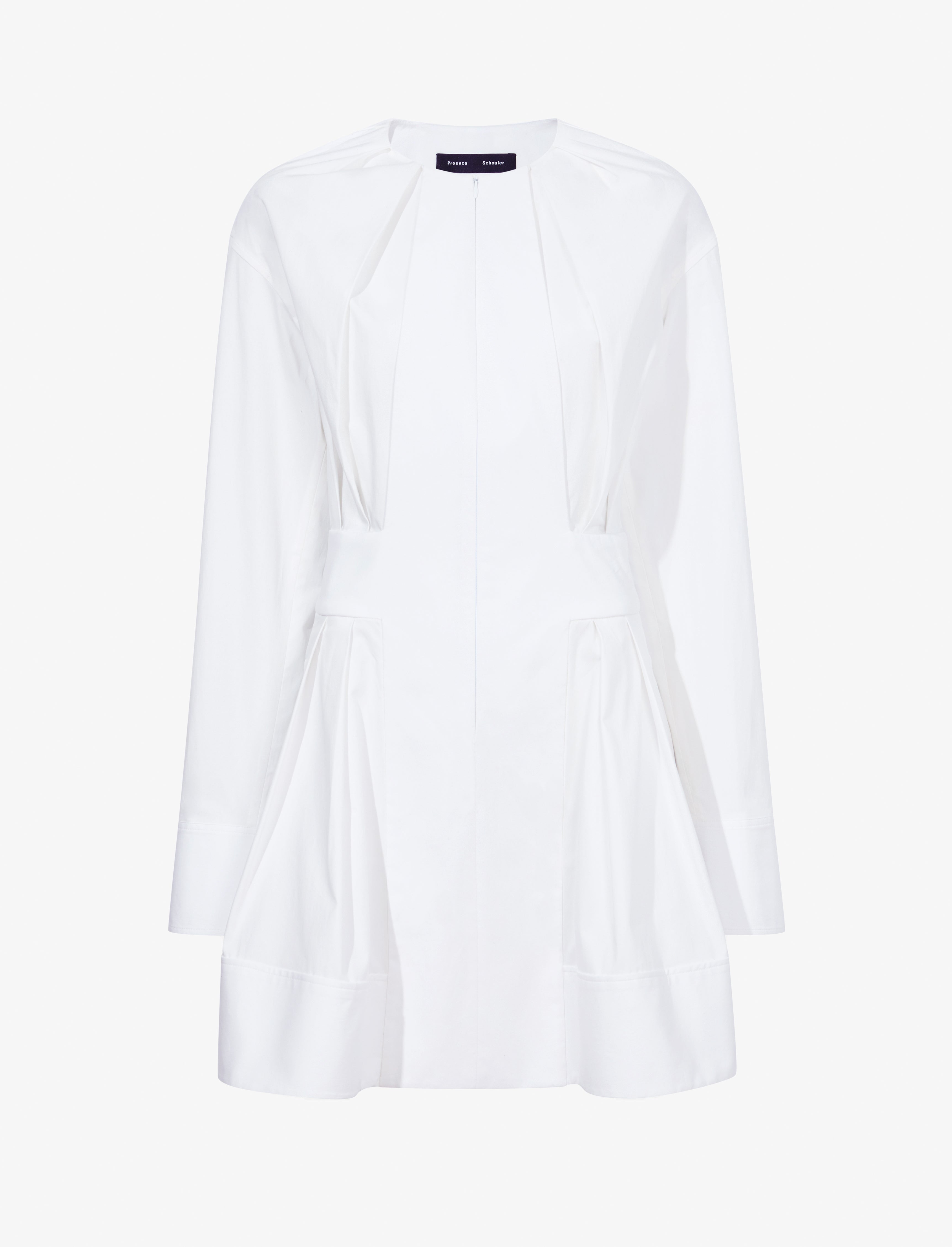 The Eileen Dress in Eco Poplin is cut from crisp stretch-cotton poplin to an A-line silhouette that’s accentuated with gathered pleats. Featuring long sleeves and a concealed zip front fastening. Details • White • Crew neck • Long sleeves • Gathered pleats • Straight hem • Concealed zip front fastening • Relaxed fit • 96% cotton, 4% elastane • SKU: R2413031SC083100 Size & Fit • Model is 5'10'' with 31.5'' bust / 35'' hips. Wearing size 4 Care • 96% cotton, 4% elastane • Dry clean only