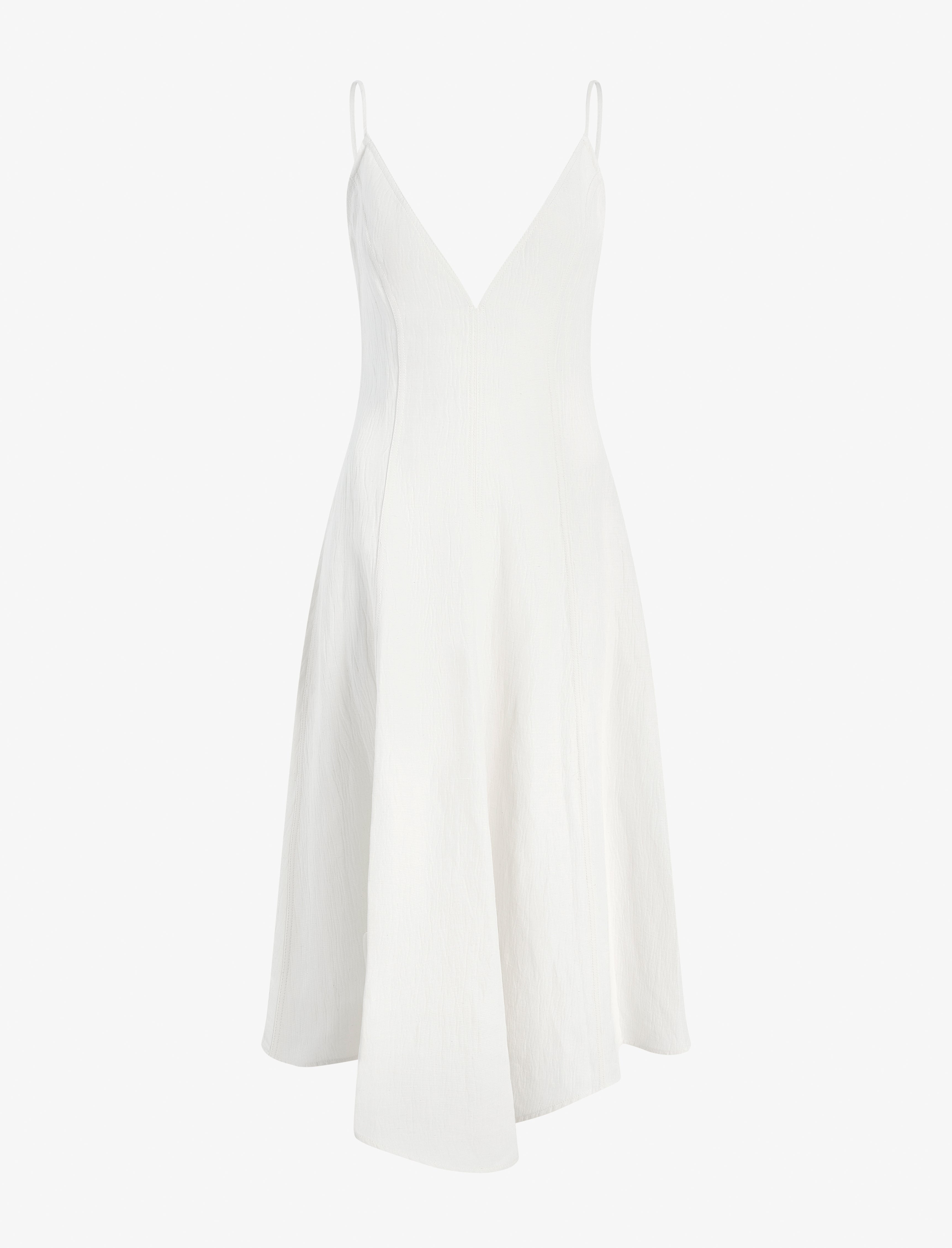 The Elaine Dress in Cotton Viscose Linen is crafted to an A-line silhouette with a deep V-neckline and side slip pockets. Finished with an asymmetric curved hemline. Details - Ecru - V-neckline - Slim shoulder straps - Side slip pockets - Concealed back zipper closure - Asymmetric hem - A-line silhouette - Slim fit - 51% viscose, 26% linen, 23% cotton - SKU: R2533027BY330103 Size & Fit - Model is 5'9.5'' with 32'' bust / 34'' hips. Wearing size 4 Care - 51% viscose, 26% linen, 23% cotton - Dry clean only