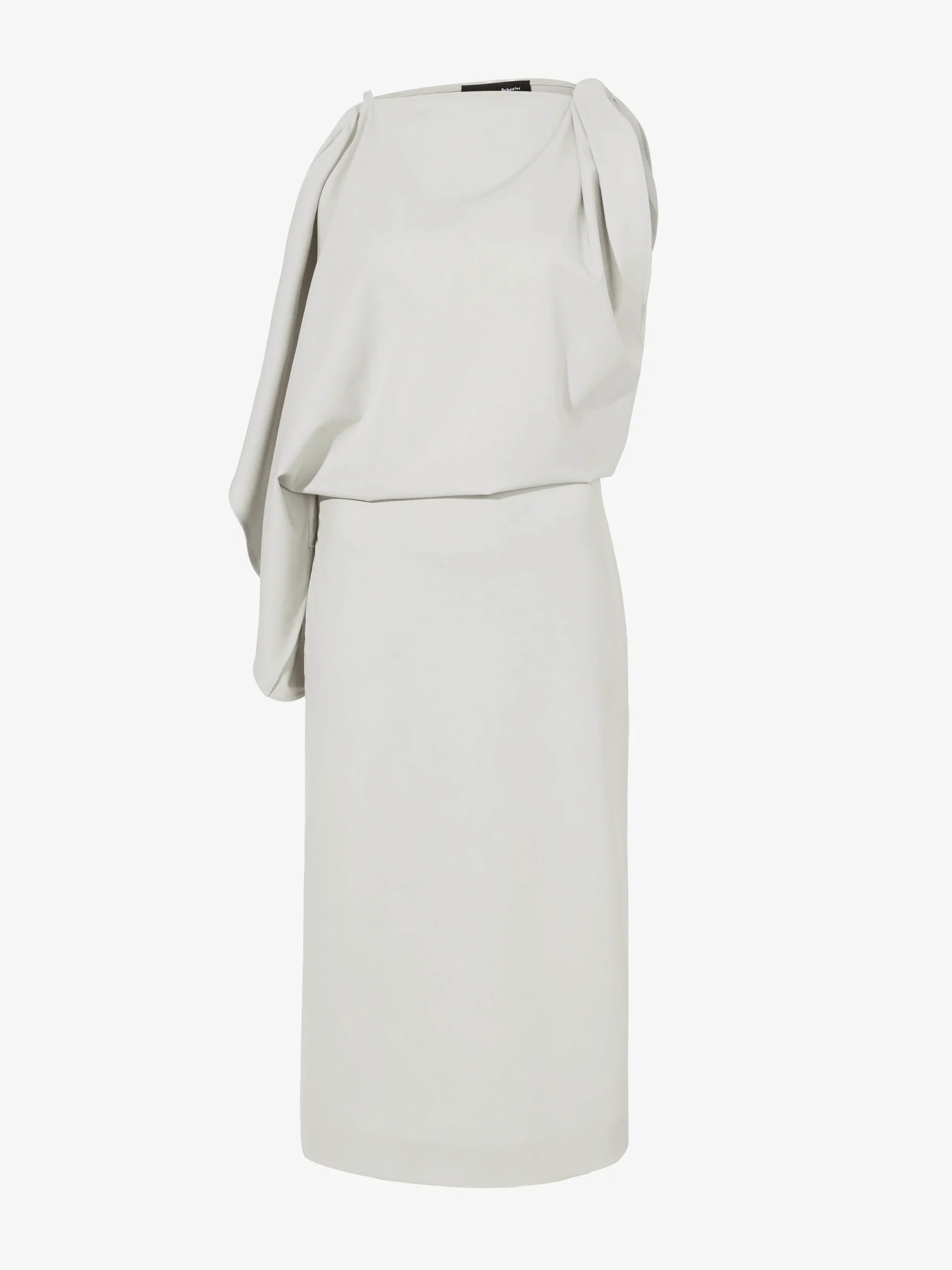 Details - Taupe - Asymmetric neckline - Sleeveless - Twisted strap detail - Side draping - Zipper closure - Calf-length skirt - Straight hem - Slim fit - 76% virgin wool, 22% polyamide, 2% elastane - SKU: R2513008AW150253 Size & Fit - Model is 5'10'' with 32'' bust / 34'' hips. Wearing size 4 Care - 76% virgin wool, 22% polyamide, 2% elastane - Dry clean only