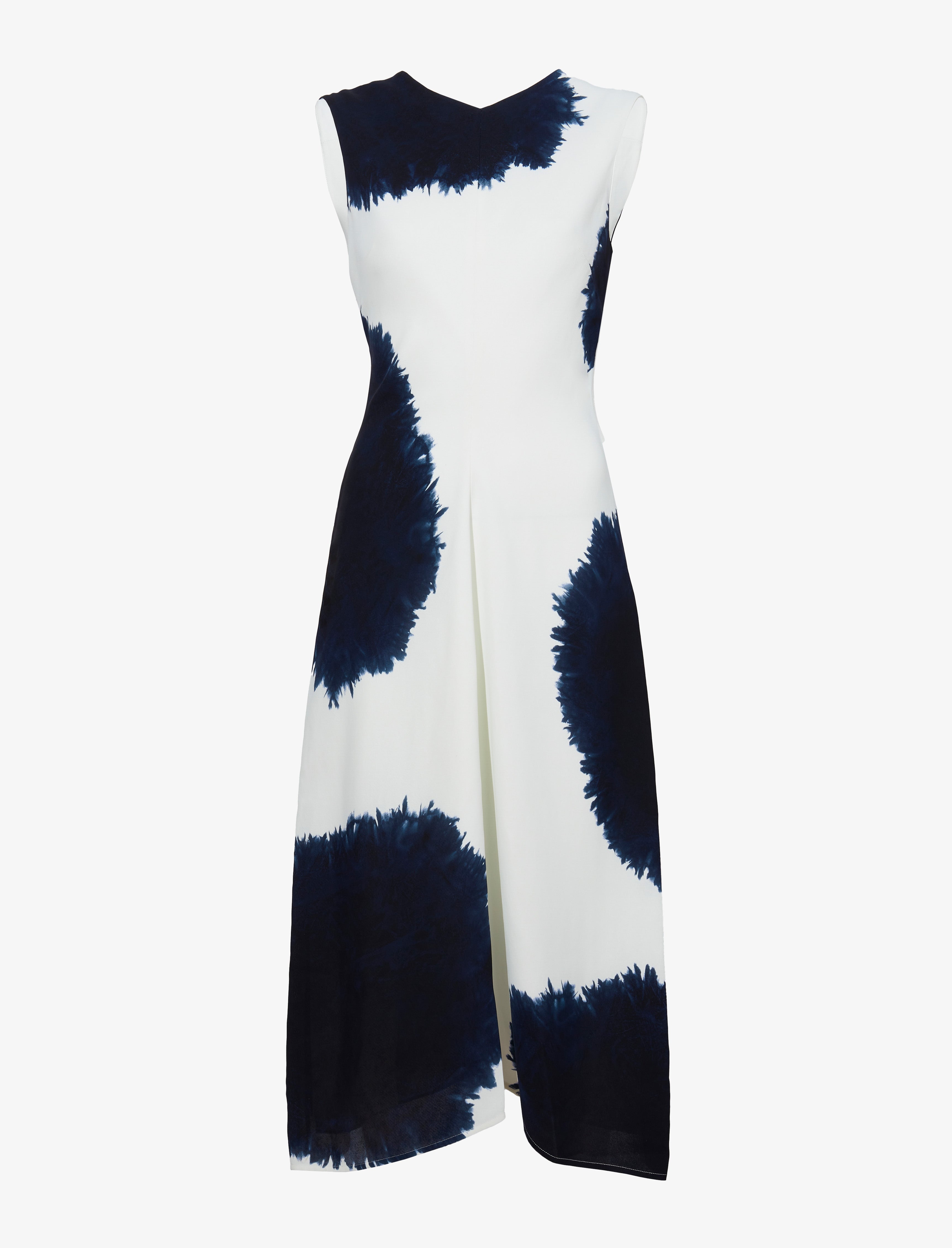 The Ella Dress in Printed Viscose Crepe is crafted to a slim A-line silhouette with a shallow V-neckline. Complemented with soft ruching along the waist and an invisible center back zipper. Details • White, blue • Printed fabrication • Sleeveless • Shallow V-neck • Ruching at waist • Invisible zipper • Mid length • A-line silhouette • 100% viscose • SKU: R2423026BYP233114 Size & Fit • Model is 5'10'' with 29'' bust / 34'' hips. Wearing size 4 Care • 100% viscose • Dry clean only