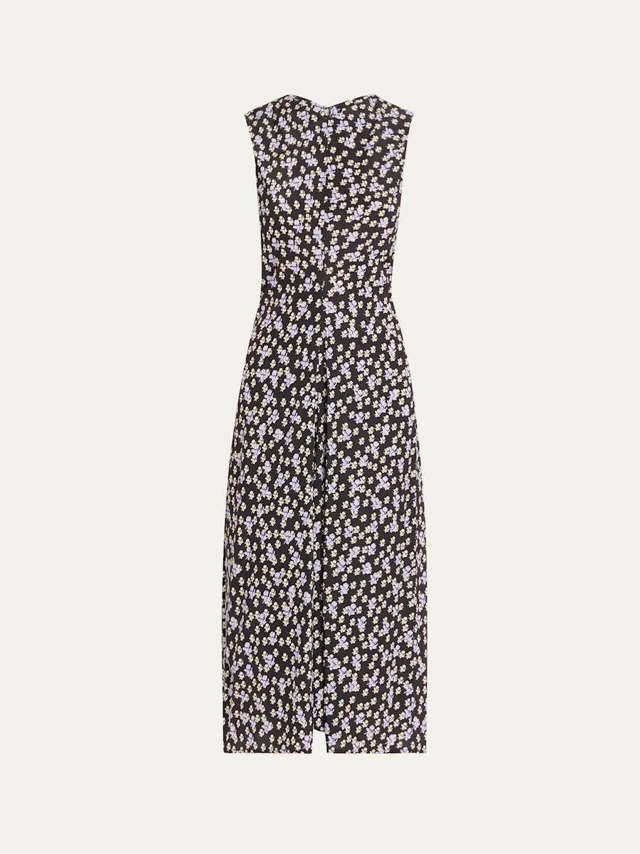 Proenza Schouler "Ella" dress crafted from matte satin in floral print High V neckline Sleeveless Hem falls below the knee Slim a-line silhouette Ruched waist Back zip Viscose/silk/spandex Dry clean Imported Online Inquiries: BGS21_B9UY2| Store Inquiries: #4977509