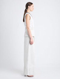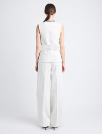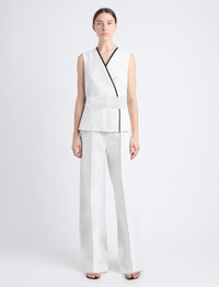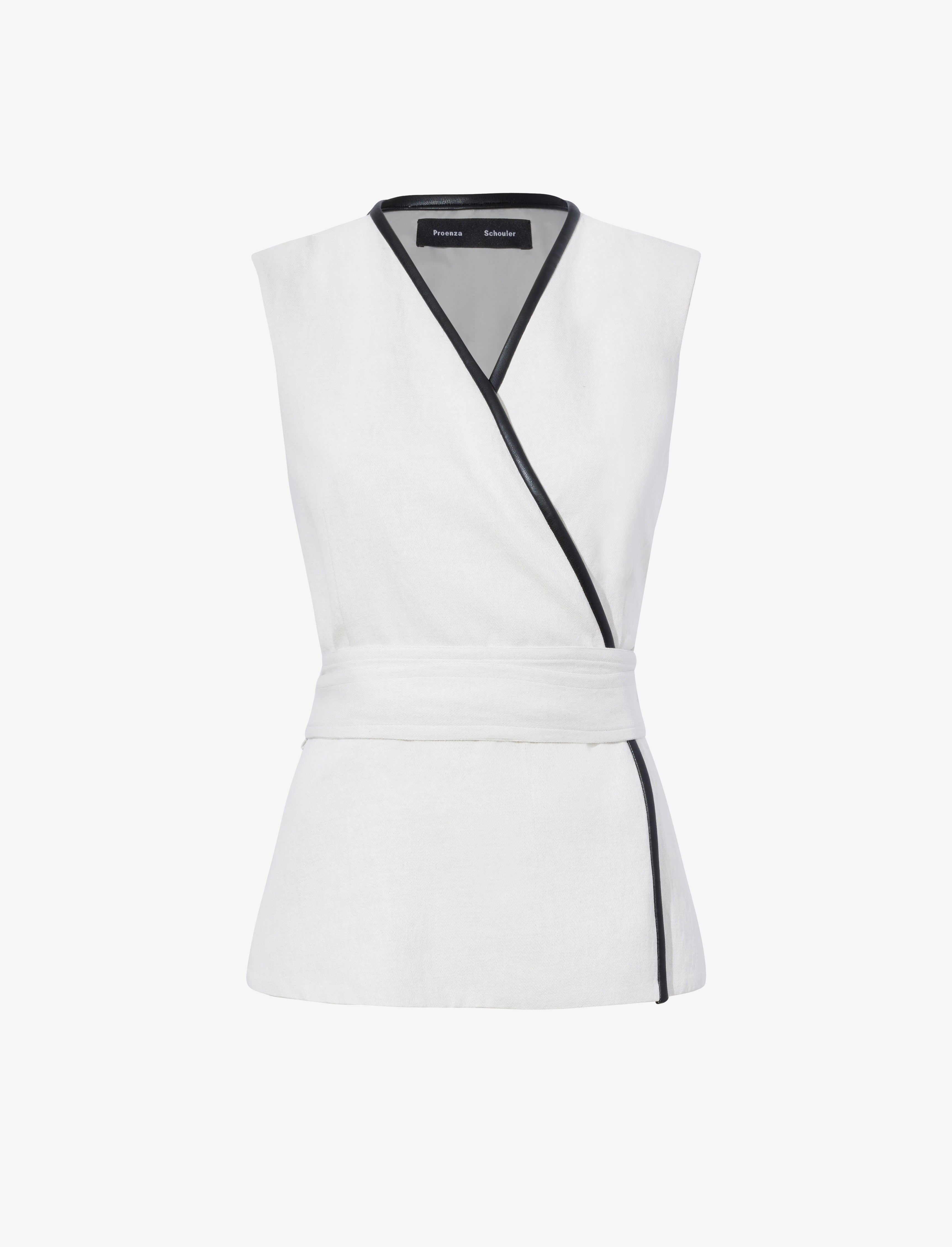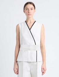 The Elliot Top in Cotton Linen is cut to a sleeveless wrap style silhouette with a V-neckline and self belt that ties at the center back waist. Finished with faux leather trims. Details - Ecru - V-neck - Sleeveless - Self-tie belt - Faux leather trim - Straight hem - Wrap silhouette - Slim fit - 80% cotton, 20% linen - SKU: R2434002AC141103 Size & Fit - Model is 5'10'' with 33'' bust / 35'' hips. Wearing size 4 Care - 80% cotton, 20% linen - Dry clean only