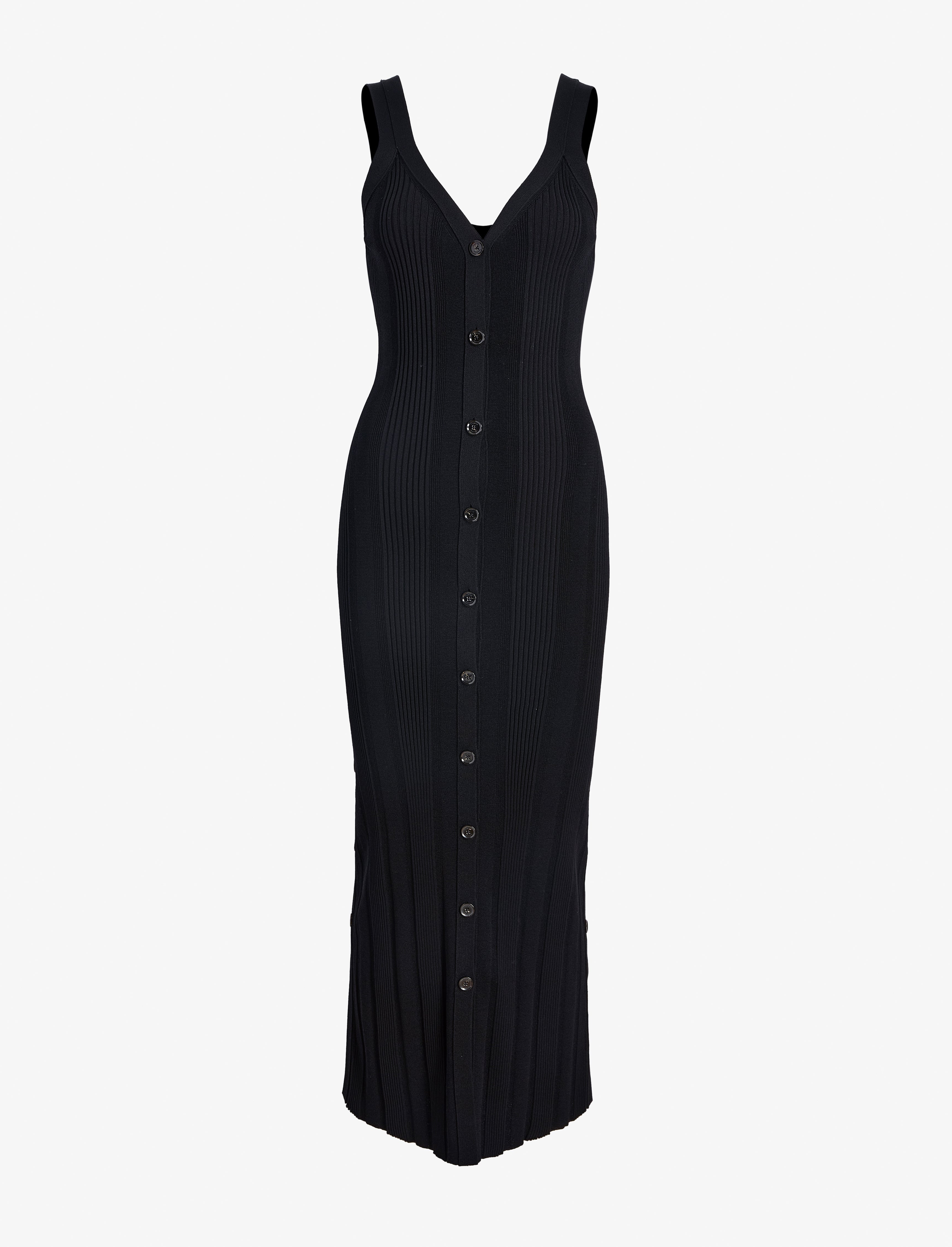 The Ellis Dress in Column Rib features a slim V-neck silhouette, accented with button plackets along the center front and sides. Details - Black - V-neckline - Sleeveless - Center button placket - Fixed side buttons - Straight hem - Slim fit - SKU: R2537244KY353001 Size & Fit - Model is 5'11'' with 30'' bust / 35.5'' hips. Wearing size Small