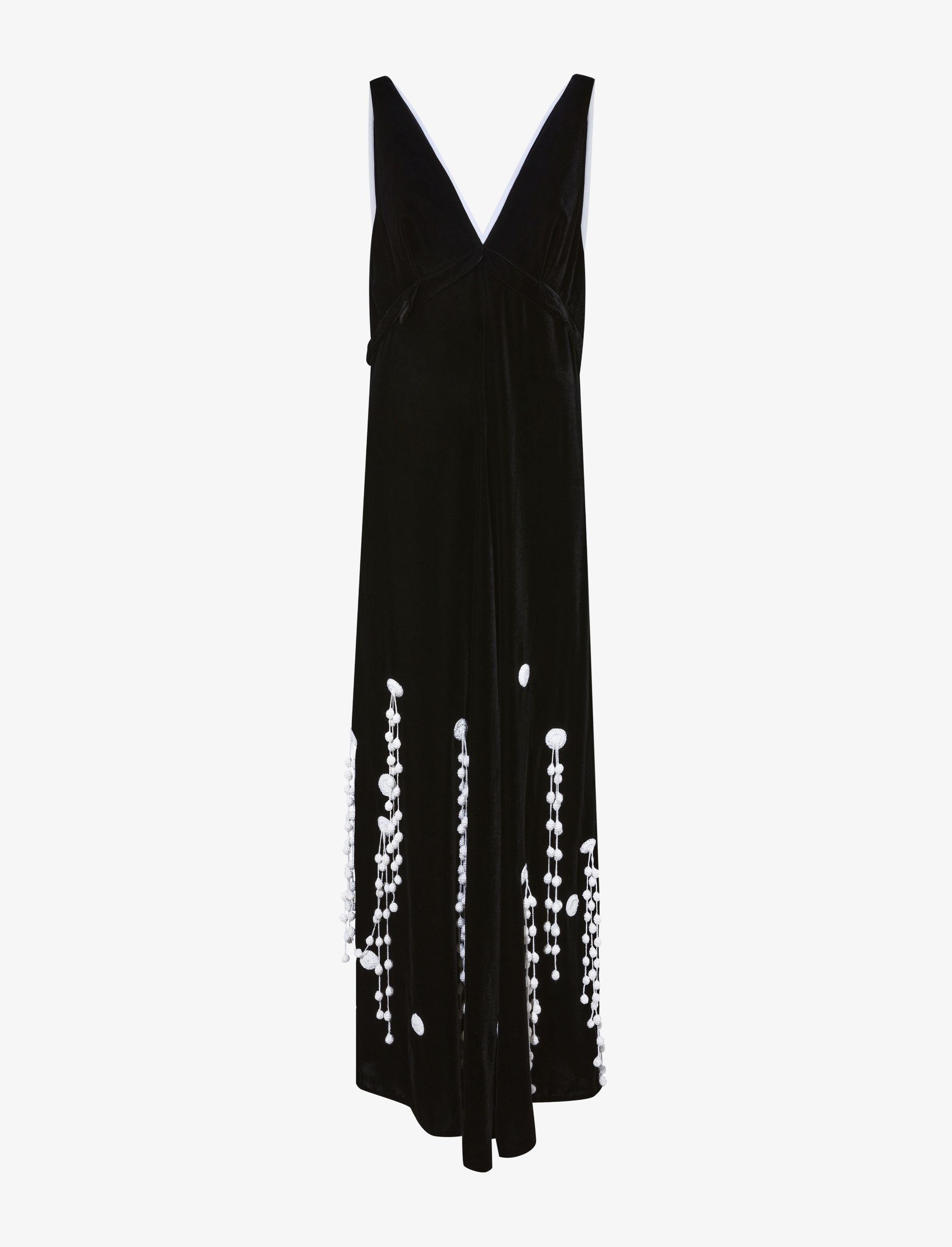 The Embroidered Velvet Dress is cut to an A-line silhouette with origami-like gathering at the waist and contrast white embroidery. Detailed with a deep V-neck and pleated trim at the bust. Black Layered design Deep V-neck and back Sleeveless Gathering and pleated trim at bust Asymmetric maxi-length hem Concealed zip side fastening 65% rayon, 35% cupro Made in Italy SKU: R2343025VY016001