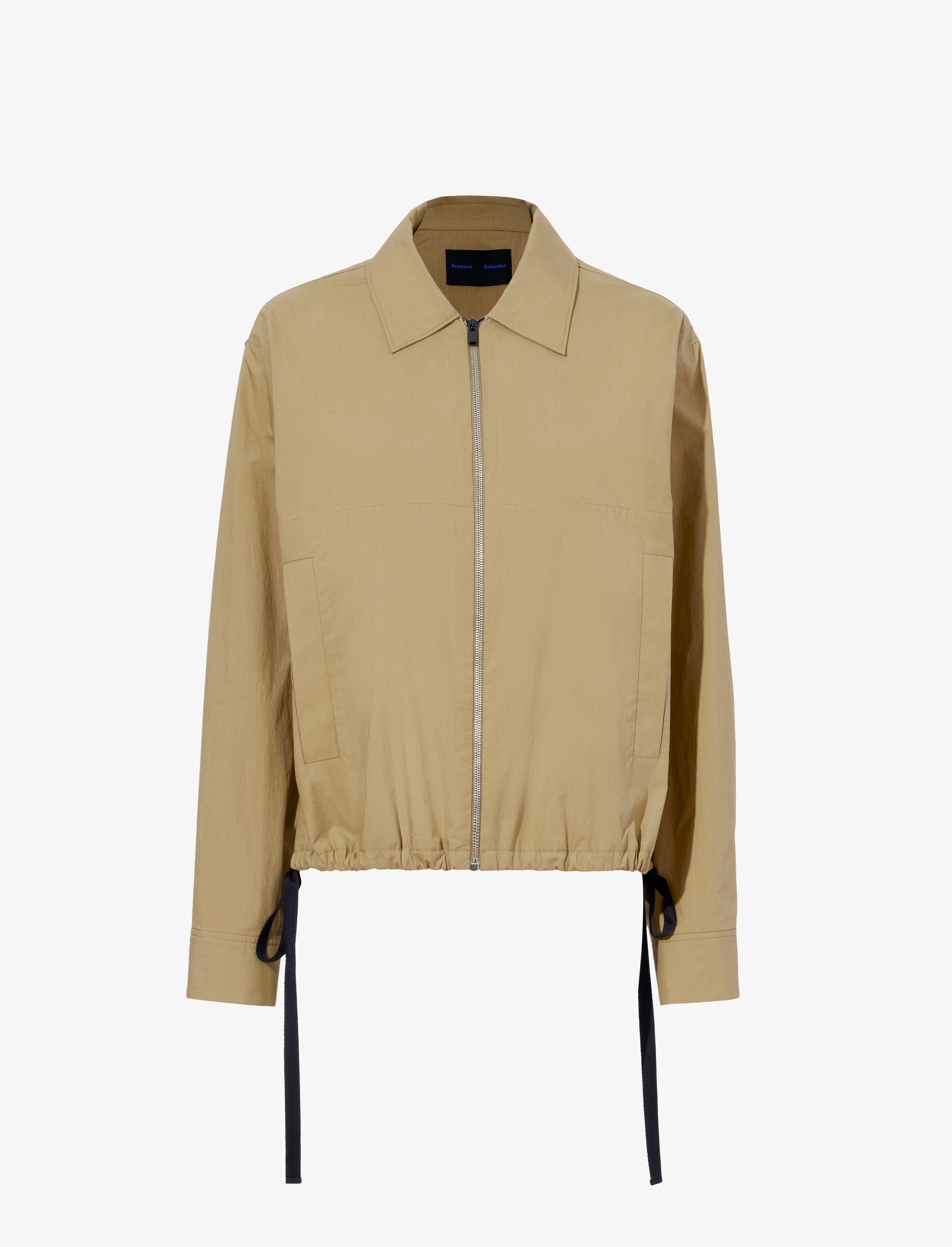 The Emerson Jacket in Washed Cotton Poplin is crafted in a lightweight breathable fabrication. Featuring a point collar, front pockets, and gathered open side hems with adjustable ties. Details • Drab • Lightweight • Point collar • Long sleeve • Front pockets • Adjustable side ties • Gathered hem • Fitted silhouette • 100% cotton • SKU: R2422000SC087241 Size & Fit • Model is 5'11'' with 32'' bust / 35'' hips. Wearing size Small Care • 100% cotton • Dry clean only