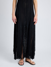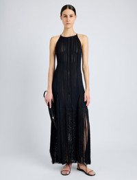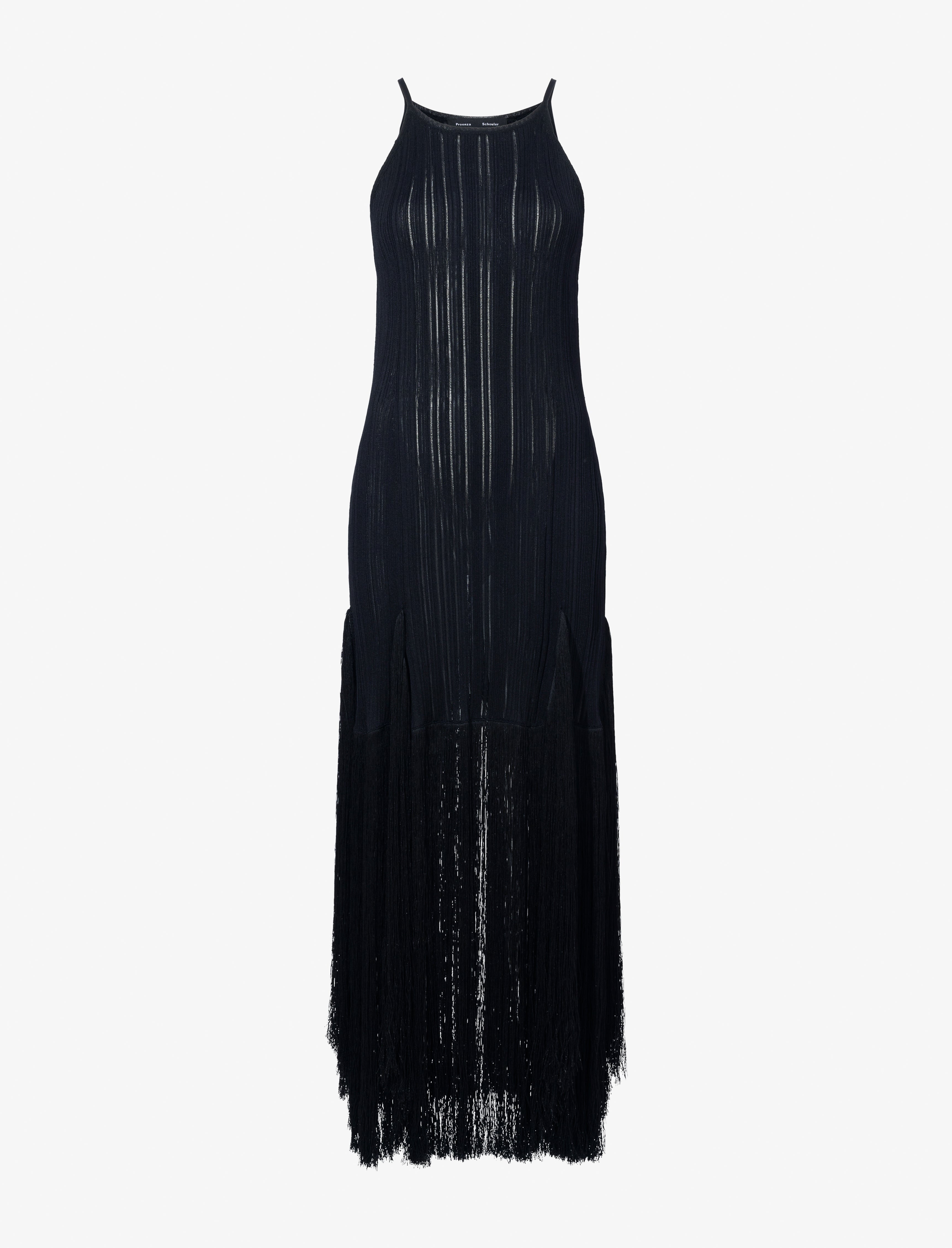The Everly Dress in Viscose Fringe Knit is crafted in a fluidly draped, slightly sheer silhouette with a halter-style neckline, finished with fringe tasseling along the hem. Details - Black - Semi sheer - Halter-style neckline - Sleeveless - Fringe tassel hem - Slim silhouette - 83% viscose, 9% cotton, 8% polyamide - SKU: R2517211KY341001 Size & Fit - Model is 5'10'' with 32'' bust / 34'' hips. Wearing size Small Care - 83% viscose, 9% cotton, 8% polyamide - Dry clean only