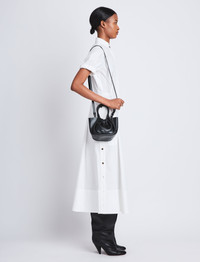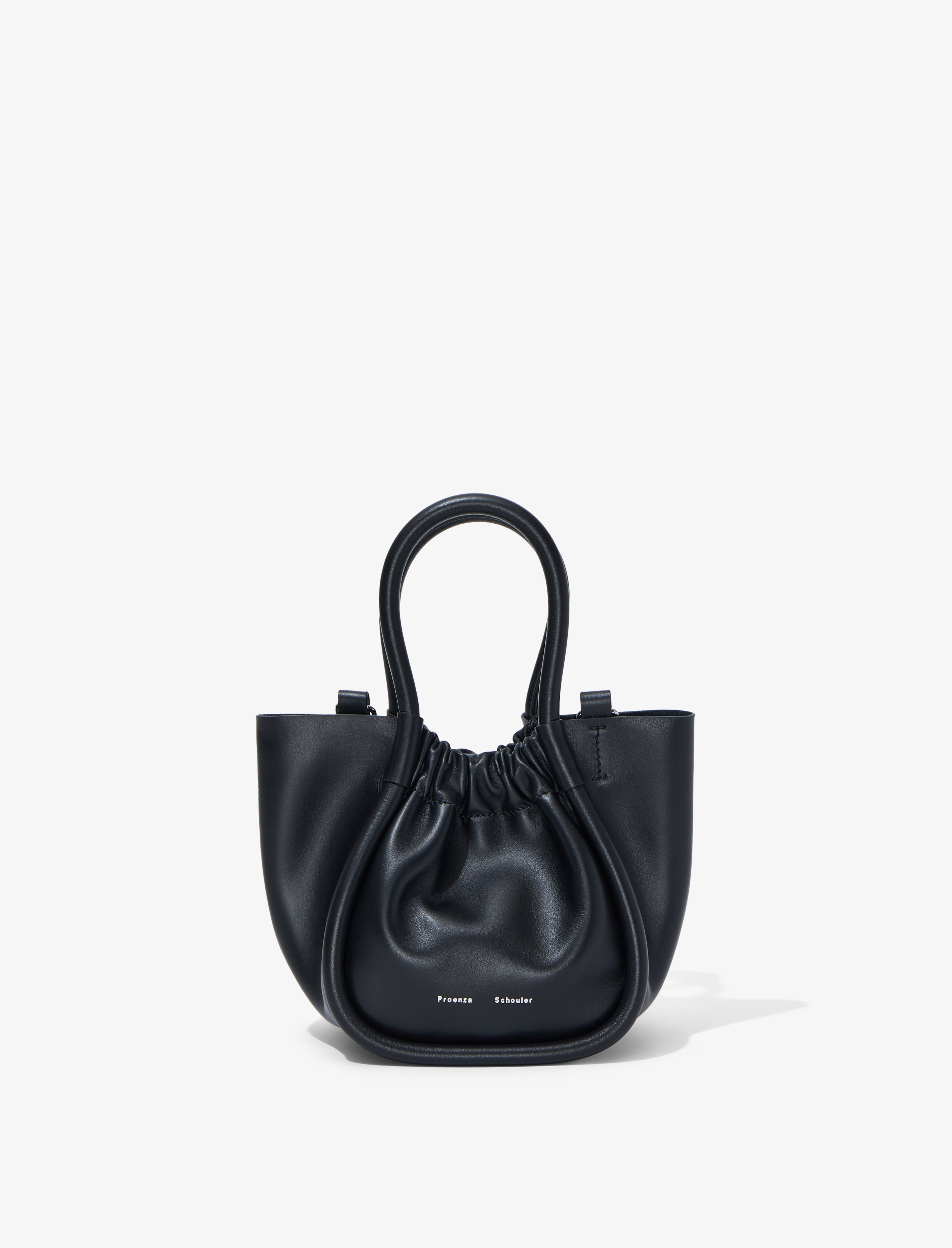 The Extra Small Ruched Tote is crafted to an unstructured, sculptural silhouette. Wide piping sweeps up to a ruched open top and two curved top handles. Details • Black • Detachable, adjustable shoulder strap • Top handles • Ruched open top with magnetic fastening • Silver foil logo at front • Suede lining with zip pocket • Silver-tone metal hardware • 100% calfskin • SKU: HB241034C289P001 Size & Fit • W: 21cm x H: 16cm x D: 12cm • Shoulder Strap: 57cm Care • 100% calfskin • Our bags are hand crafted using genuine leather. Variations in tone, marks or grain are common and should not be considered imperfections. Like all natural materials, leather reacts to the atmosphere. Humidity, rain, and sunlight can damage leather. Should a slight white coating appear on the surface of the leather, it can easily be removed using a dry cloth. Should the leather get wet, please absorb the water immediately with a dry cloth. Overexposure to sunlight can stain or alter the color of the leather.