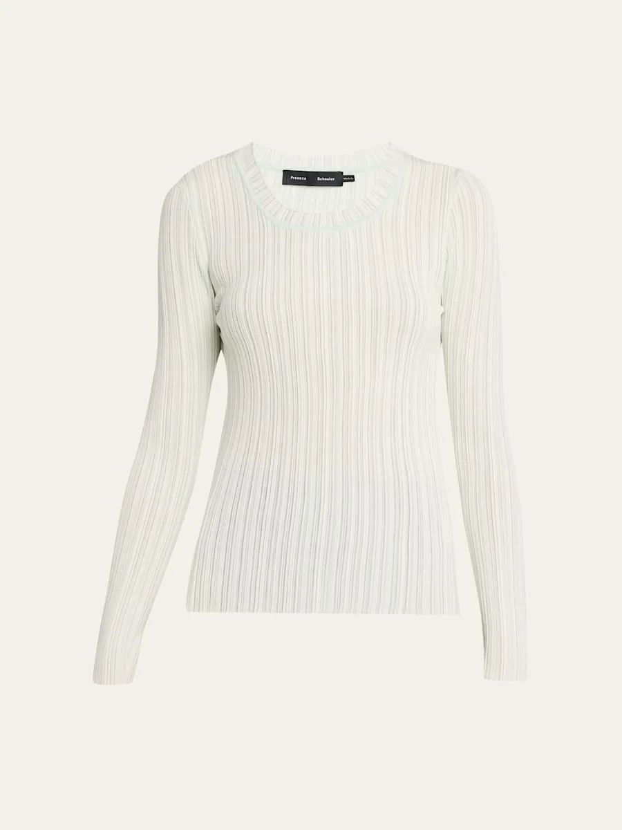 Proenza Schouler White Label "Fedda" ultrasoft woolblend top finished with a ribbed texture Scoop neckline Long sleeves Classic fit Hem sits at the hip Pullover style Viscose/wool Dry clean Imported SIZE amp; FITModel measurements: 5'10" tall Model is wearing a US size 4/Small