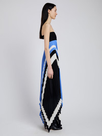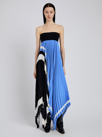 The Fia Dress in Technical Crepe features a custom blue coloration intertwined within a large abstract print, boasting a knit bodice and handkerchief-style skirt. Finished with fine accordion pleats throughout. Details - Sky blue multi - Customized blue - Strapless - Knit bodice - Side zipper fastening - Accordion pleats - Handkerchief skirt - Asymmetric hem - 100% polyester - SKU: R2543008BY355981 Size & Fit - Model is 5'10.5'' with 28'' bust / 34.5'' hips. Wearing size 4 Care - 100% polyester - Dry clean only