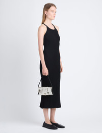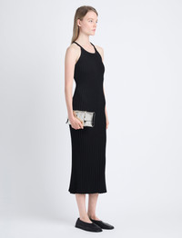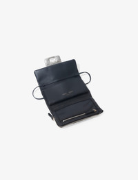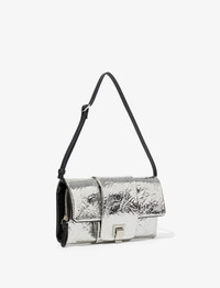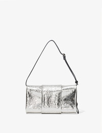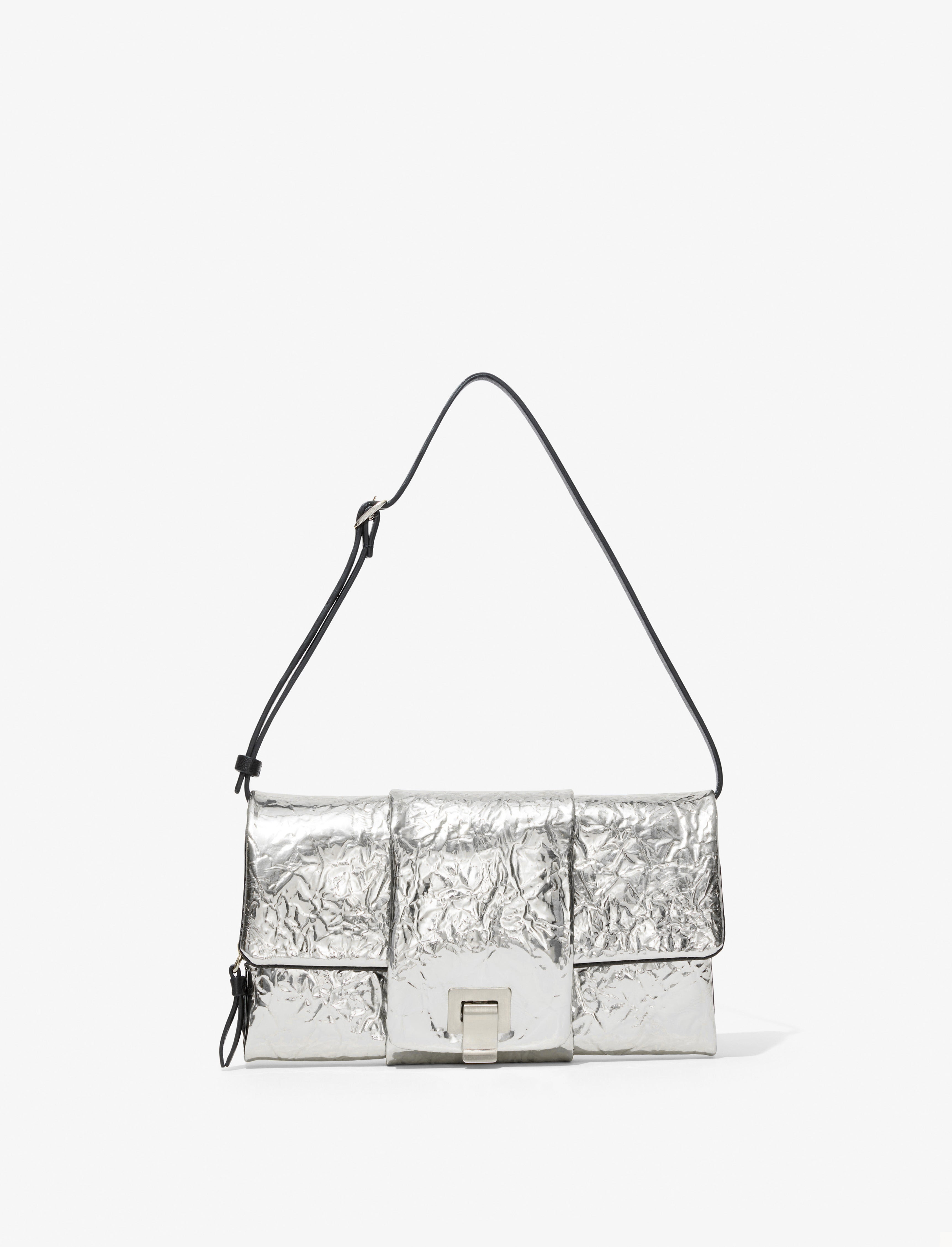 Spring 2024 Runway Collection | Look 21 The Flip Shoulder Bag is crafted in metallic lacquered nylon with three functional compartments. Features a front flap and a PS1 closure. Details • Silver • Crinkled metallic • Tri-Fold shoulder bag • Card slots • Coin pockets • PS1 closure • 85% polyurethane, 15% polyester; trims: 100% lamb leather • SKU: HB242052F418S044 Size & Fit • W: 21.5cm x H: 12.5cm x D: 5.5cm • Top Handle Length: 20.5cm Care • 85% polyurethane, 15% polyester; trims: 100% lamb leather