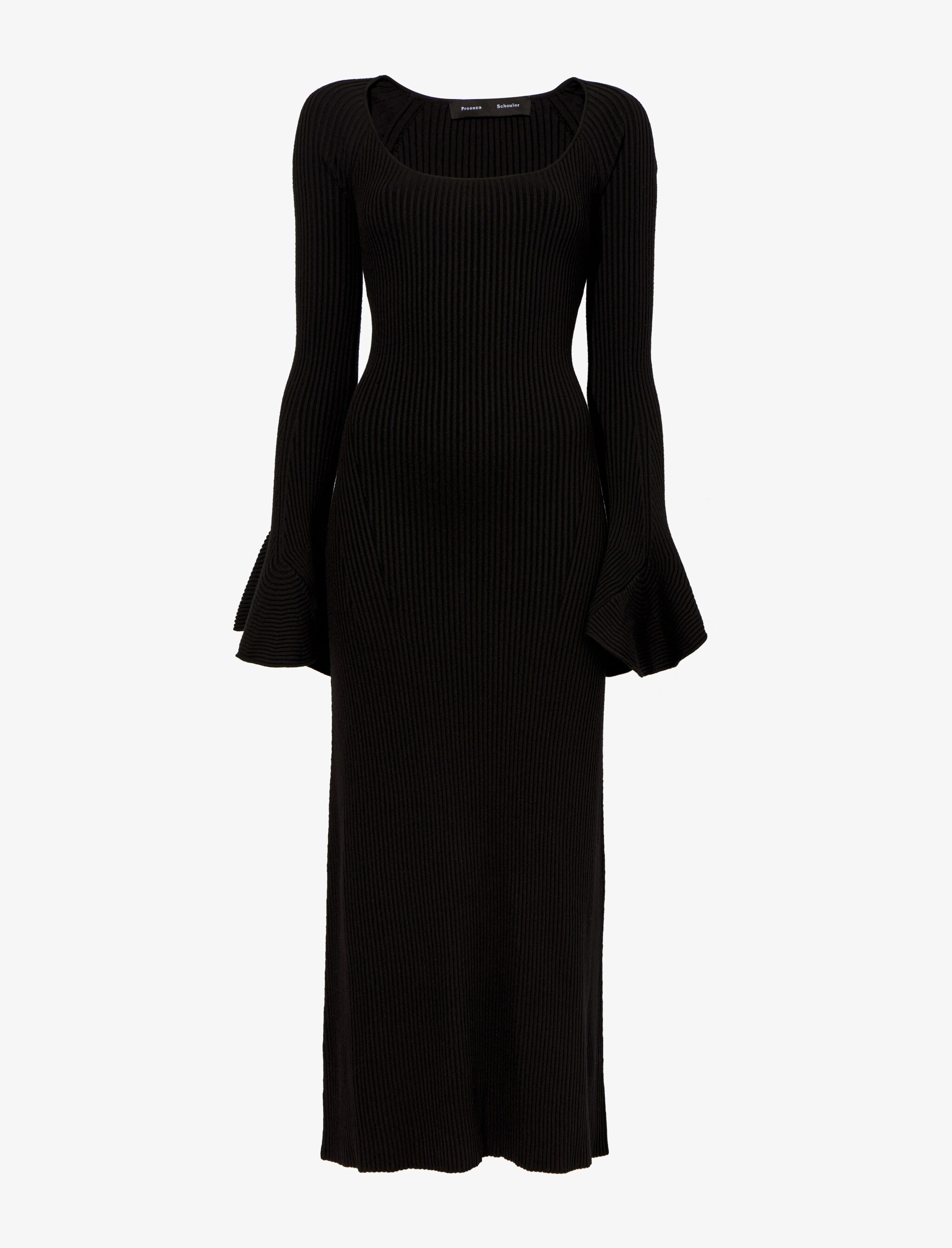 The Fluted Rib Knit Dress is crafted in a silk and cashmere blend to a slim-fitting silhouette. Ribbed-knit construction. Scoop neck and long sleeves with extended, fluted cuffs. Mid-length hem. 85% silk, 15% cashmere. SKU: R2317048KY277001