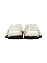 Buffed leather sandals in off-white. · Open square toe · Ruching at elasticized slingback strap · Gold-tone logo-stamp at molded footbed · Treaded rubber sole Supplier color: Off-White Upper: leather. Sole: rubber. Made in Italy 231288F124008