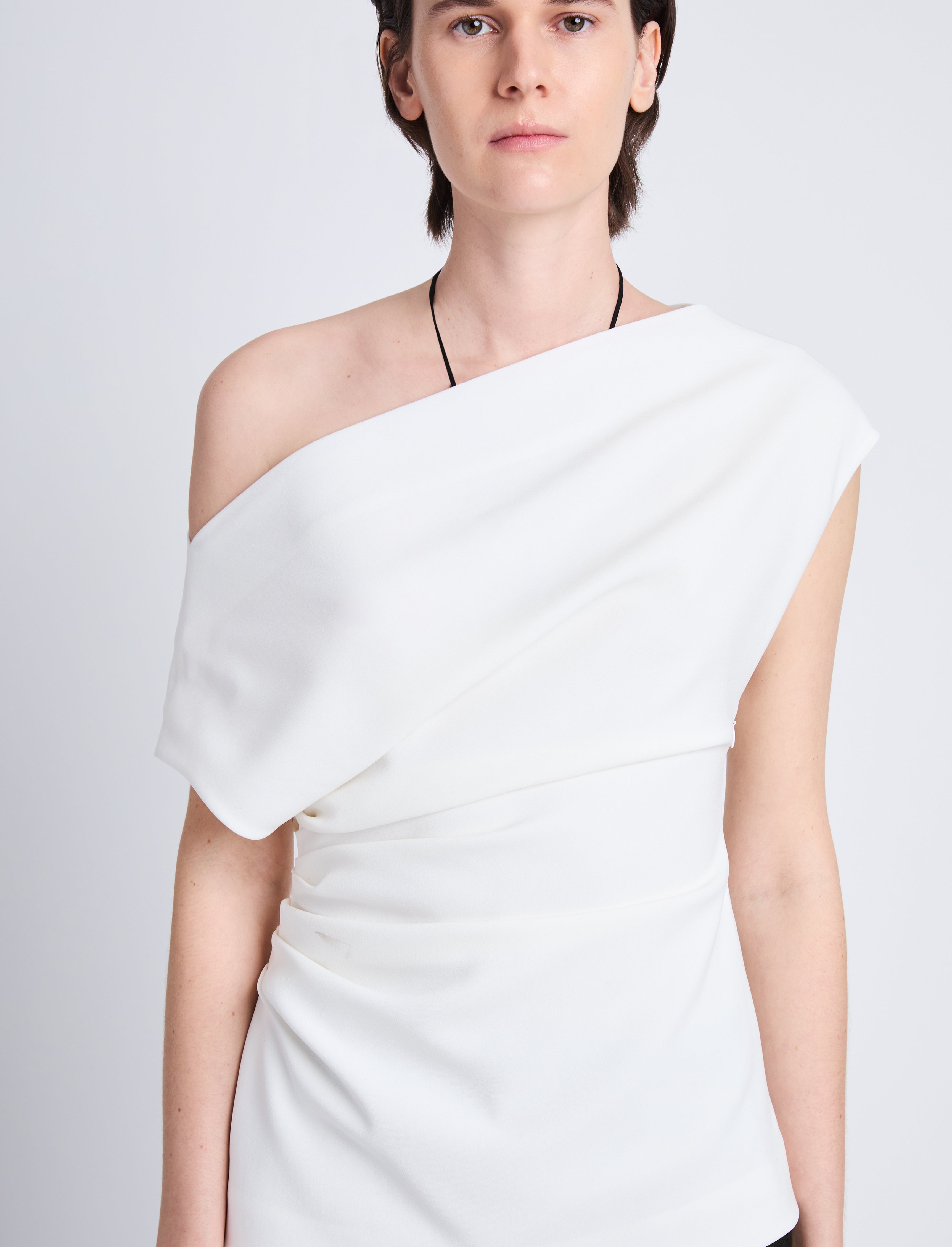 The Francesa Off The Shoulder Top in Matte Viscose Crepe is shaped with soft gathering at the side. Finished with cap sleeves and a draped boat neck. Details • White • Boat neck • Short cap sleeves • Gathering at side • Curved hem • Slim fit • 70% triacetate, 30% polyester • SKU: R2414022BY116100 Size & Fit • Model is 5'11'' with 32'' bust / 34'' hips. Wearing size 4 Care • 70% triacetate, 30% polyester • Dry clean only