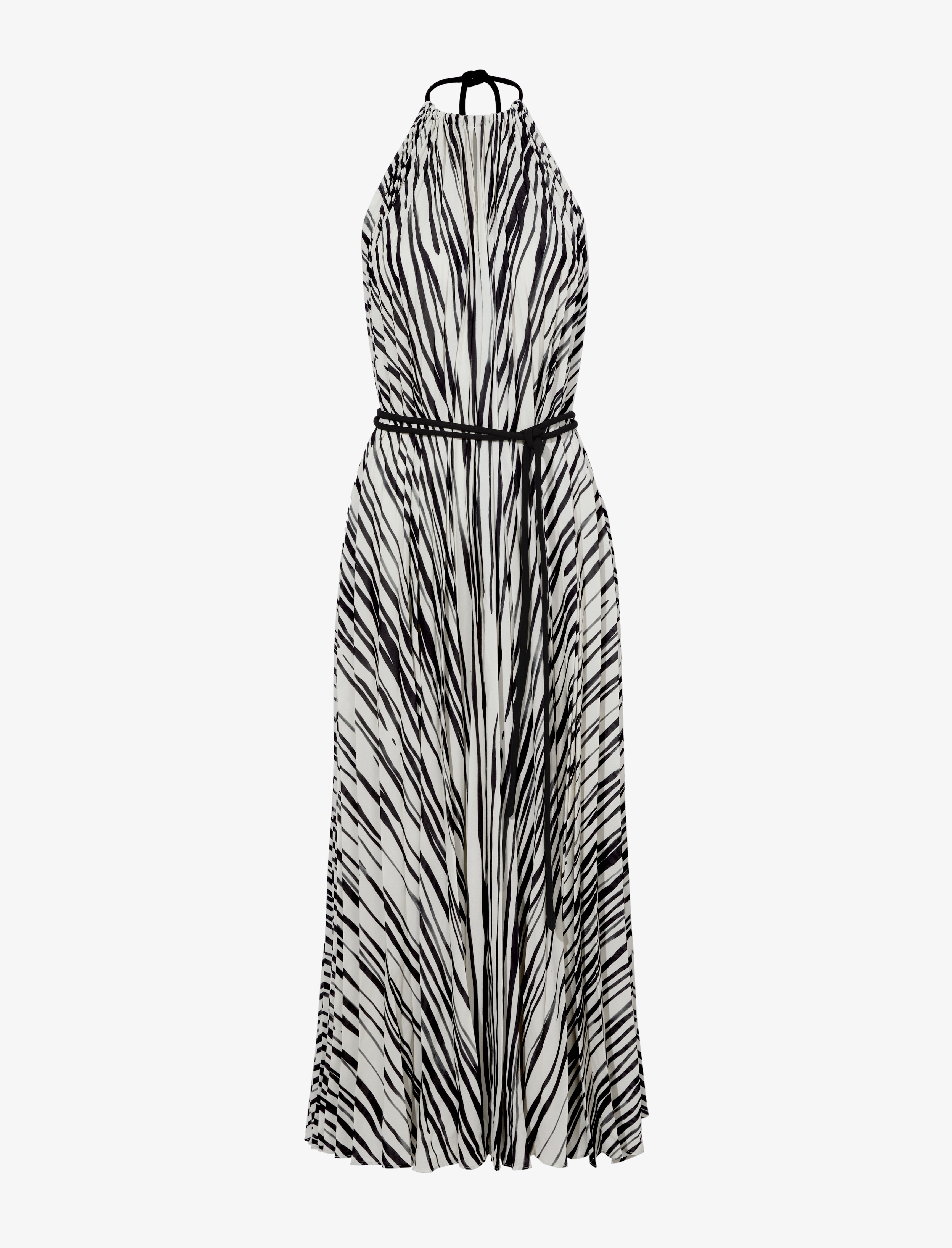 The Frida Halter Dress in Printed Sheer Pleated Chiffon is patterned with bold stripes. Punctuated with all-over pleating and a self-tie waist belt. Details • White, black • Stripes • Halterneck with self-tie fastening • Sleeveless • Self-tie waist belt • Straight mid-length hem • 100% polyester • SKU: R2413013BYP284116 Size & Fit • Model is 5'11'' with 30'' bust / 35'' hips. Wearing size 4 Care • 100% polyester • Dry clean only