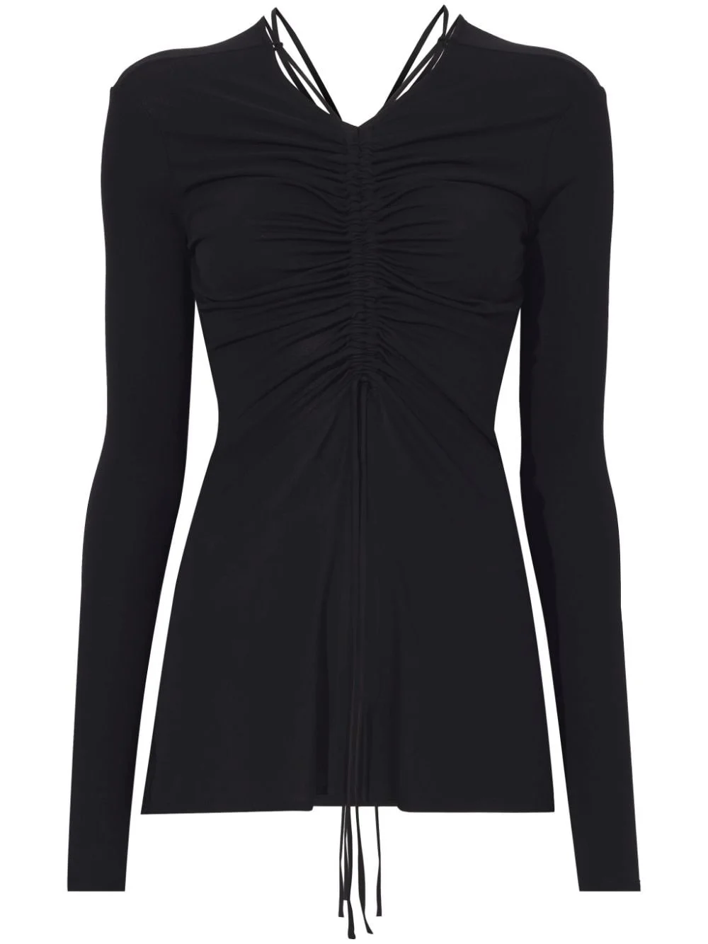 gathered-detail long-sleeve top Highlights - Black - Crepe texture - Stretch-design - V-neck - Gathered neckline - Gathered detailing - Long sleeves - Front slit - Straight hem Imported Composition Viscose 100% Washing instructions Dry Clean Only