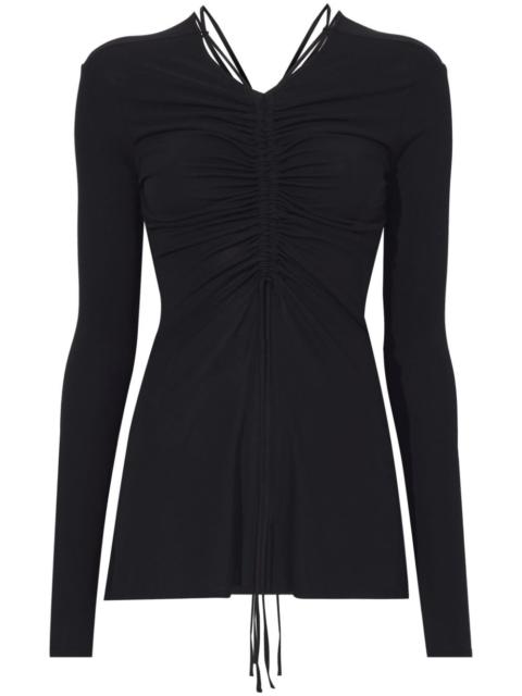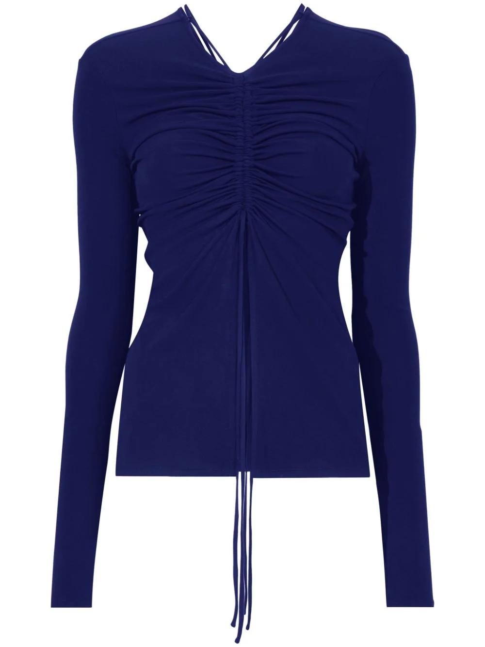 gathered-detail long-sleeve top Highlights - Indigo blue - Crepe texture - Stretch-design - V-neck - Gathered neckline - Gathered detailing - Long sleeves - Front slit - Straight hem Imported Composition Viscose 100% Washing instructions Dry Clean Only