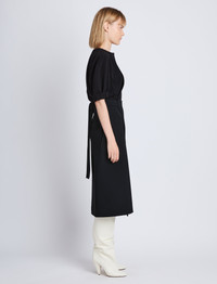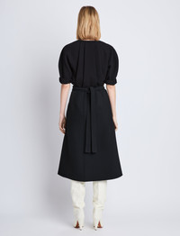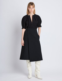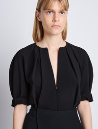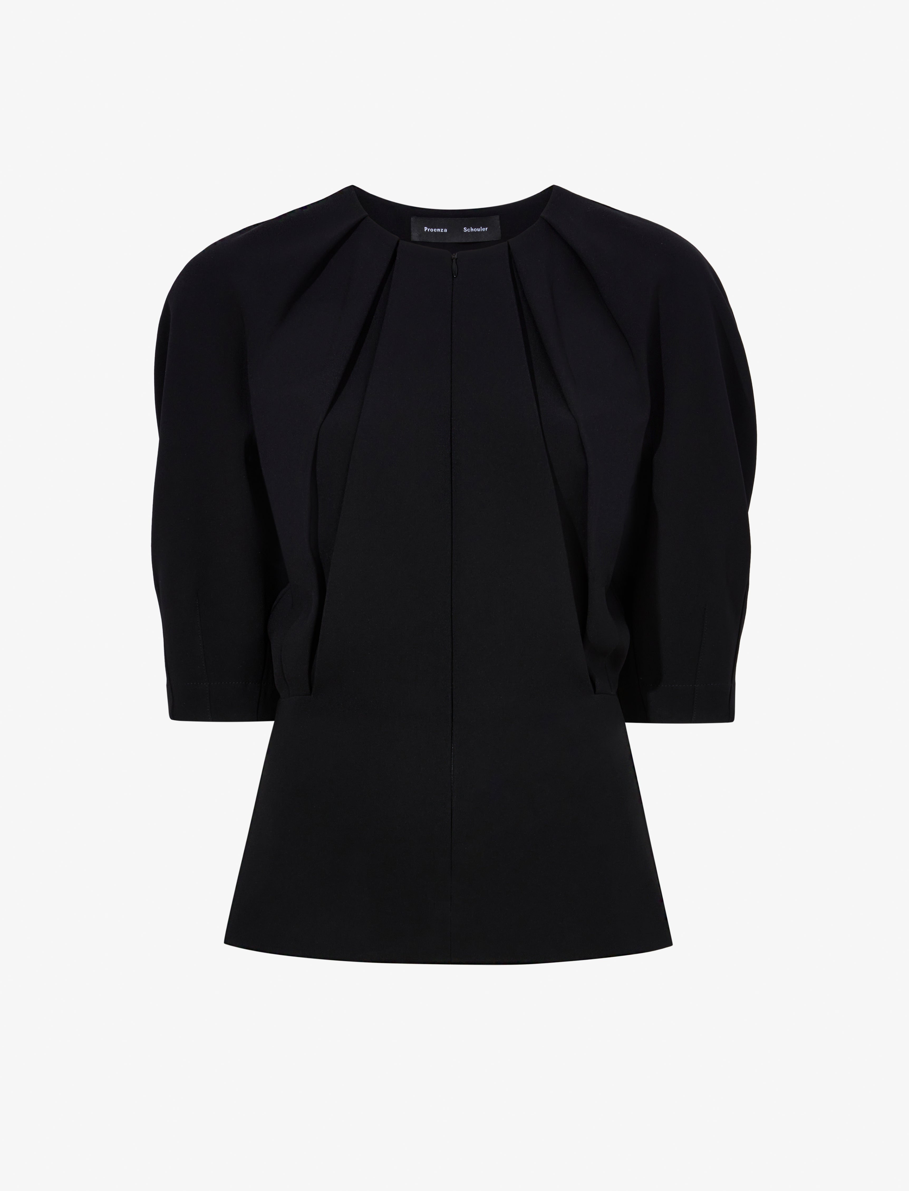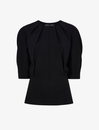 The Georgia Top in Matte Viscose Crepe is cut to a sculptural silhouette with puff sleeves and structured pleating. Featuring a zip front fastening and straight hem. Details • Black • Crepe • Crew neck • Cropped puff sleeves • Pinched pleats • Straight hem • Zip front fastening • Slim fit • 70% triacetate, 30% polyester • Made in China • SKU: R2414012BY116001 Size & Fit • Model is 5'10'' with 31.5'' bust / 35'' hips. Wearing size 4 Care • 70% triacetate, 30% polyester • Dry clean only