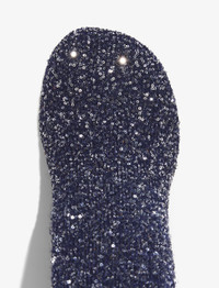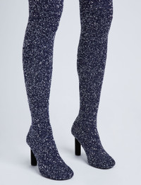 Fall 2023 Runway Collection | Look 37 The Glint Over The Knee Boots are presented in a soft, knitted construction and embellished with micro sequins. Designed to cover the length of the leg, they feature a slim fit, round toe and cylindrical velvet heel. Navy blue Sequin embellishment Block heel Leather footbed Round toe Leather sole Upper: 100% polyester; lining: 100% leather; sole: 100% leather SKU: PS41240B18090999