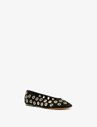 The Glove Grommet Flats are crafted in kid suede to a slip-on silhouette with a round toe and low stacked heel. Features metal grommet studs along the upper. Details - Black - Kid Suede - Slip-on silhouette - Low stacked heel - Rounded toe - Silver-tone grommets - Upper: 100% goatskin; Sole: 100% calfskin - SKU: SH252043BX006FC001 Size & Fit - True to size Care - Upper: 100% goatskin; Sole: 100% calfskin - Please refer to care instructions provided with your order.