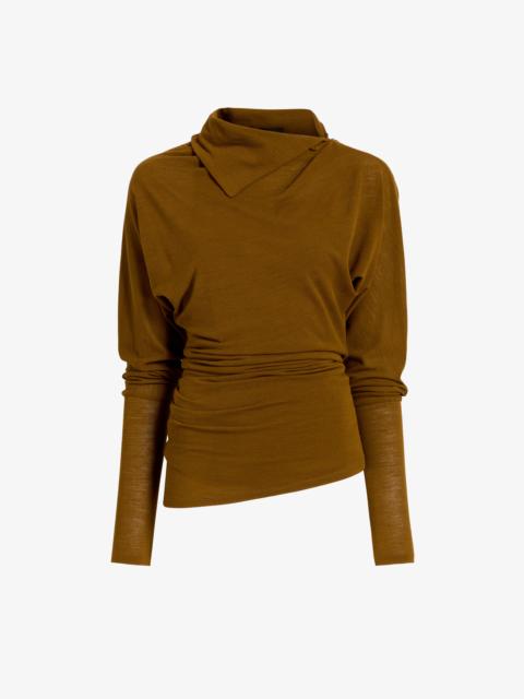 The Golda Top in Jersey is designed to a slim silhouette, with soft gathering through the bodice and sleeves. Detailed with an adjustable neckline and a fluidly draped mock neck. Details - Espresso - Draped mock neckline - Side-neck button closures - Long sleeves - Gathered detailing - Slim silhouette - 100% polyester - SKU: R2544022JY108223 Size & Fit - Model is 5'10'' with 31'' bust / 34'' hips. Wearing size 4 Care - 100% polyester - Dry clean only