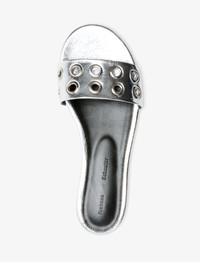 The Grommet Slides are crafted in crinkled leather to a slip-on silhouette with a rounded toe. Features metal grommet studs along the upper. Details - Silver - Crinkled metallic leather - Slip-on silhouette - Silver-tone grommets - Perforated lining - Upper: 100% goatskin; Sole: 100% calfskin - SKU: SH252045X008FC041 Size & Fit - True to size Care - Upper: 100% goatskin; Sole: 100% calfskin - Please refer to care instructions provided with your order.