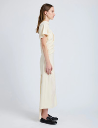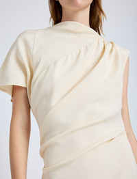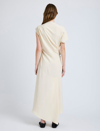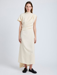 The Hallie Dress in Hammered Viscose is cut to a softly structured silhouette, featuring a draped top and subtle ruching through the body with an asymmetric hem. Details - Champagne - Mock neckline - Ruched bodice - Side zipper closure - Asymmetric hem - Slim fit - 100% viscose - SKU: R2533016BY332254 Size & Fit - Model is 5'9.5'' with 32'' bust / 34'' hips. Wearing size 4 Care - 100% viscose - Dry clean only