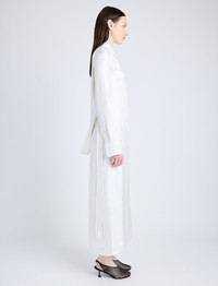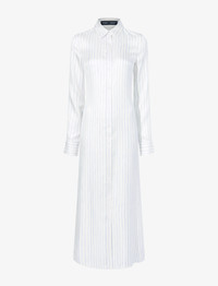 The Hannah Dress in Stripe Silk Twill is crafted to a slim, calf-length silhouette with a point collar and button front placket. Accentuated with a self-tie waist belt and detailed with monogrammed pinstripes throughout. Please note: Scarf is intended for styling purposes only and is not sold with the dress. Details - Ivory multi - Monogram detailed stripes - Point collar - Long sleeves - Button front placket - Self-tie waist belt - Buttoned sleeve cuffs - Straight hem - Slim silhouette - 100% silk - SKU: R2513016BSP178132 Size & Fit - Model is 5'11'' with 31'' bust / 36'' hips. Wearing size 4 Care - 100% silk - Dry clean only