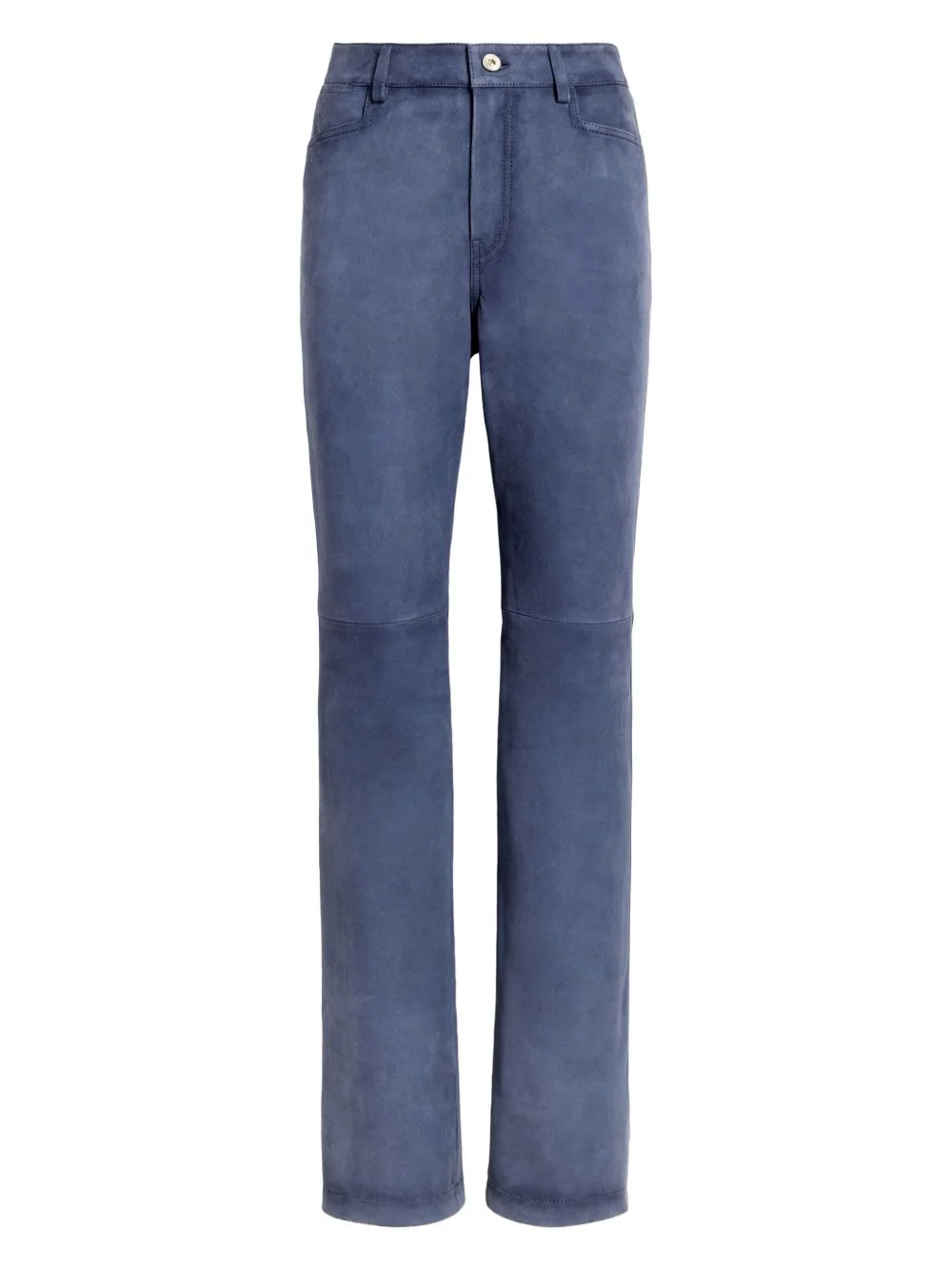 high-waisted leather trousers Highlights - Navy blue - Slip-on style - Front pockets - Belt loops - Button fastening Imported Composition Lamb Suede 100% Washing instructions Specialist Cleaning