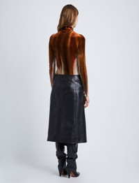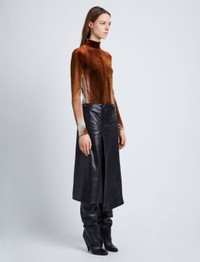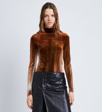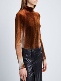 The Ice Dyed Velvet Top is cut from velvet with an ice-dye technique that fades from umber brown to grey. Featuring a mock neck and long sleeves. Please note: due to the handcrafted nature of the dyeing technique, each piece is one of a kind and will vary slightly compared to the garment pictured. Umber brown, camel brown, steel grey, light grey Mock neck Long sleeves Slim fit 46% cotton, 30% modal, 22% nylon, 2% elastane Made in the United States SKU: R2344004JYP43217