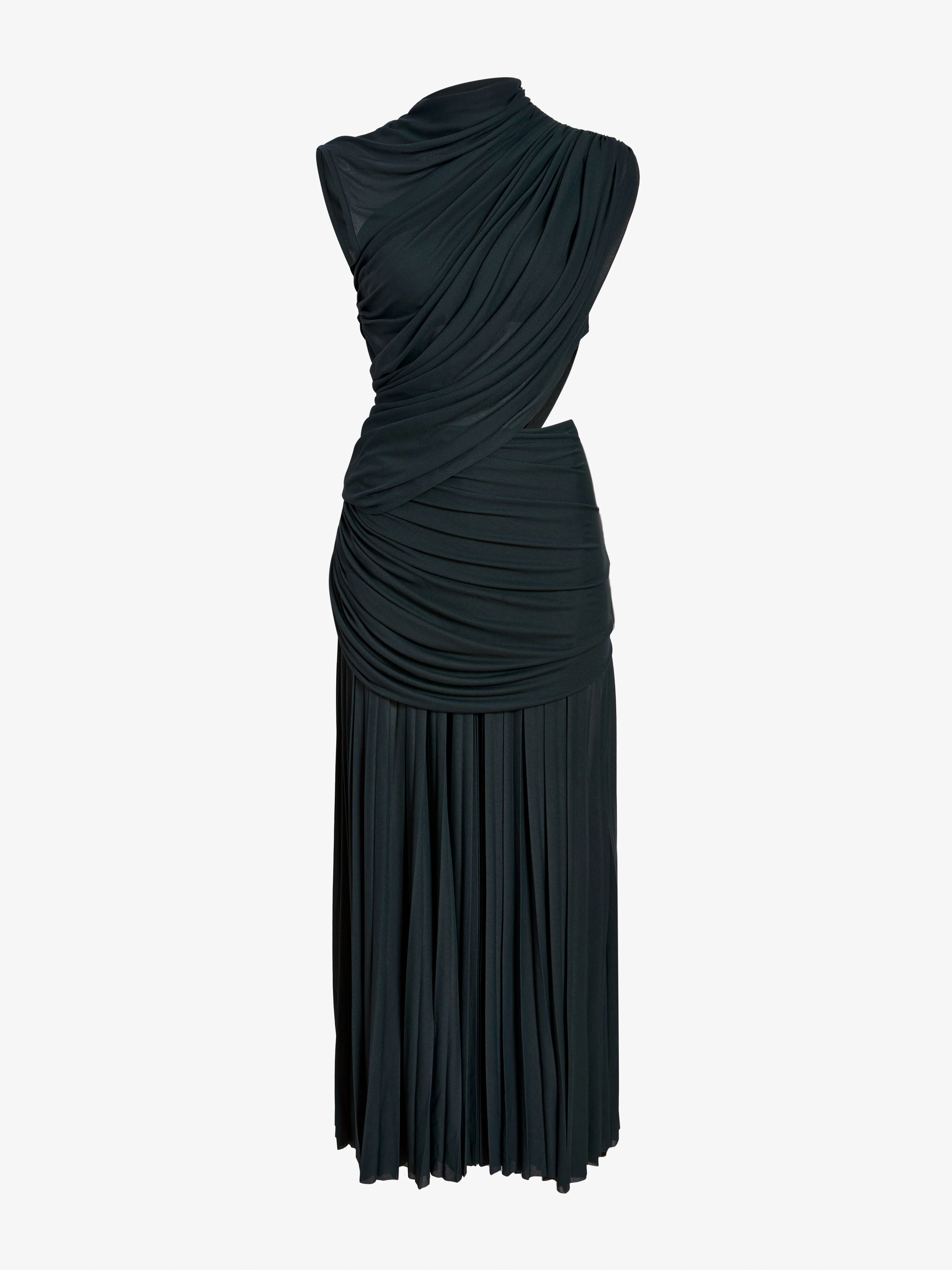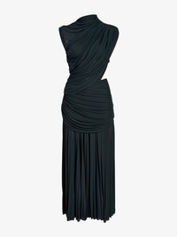 The Irma Dress in Gauzy Jersey features a fluidly draped silhouette that skims the body, highlighted by a cut-out at the side waist. The lower skirt is finished with delicate accordion pleats. Details - Bottle green - Mock neckline - Cap sleeves - Side waist cut-out - Concealed zipper fastening - Accordion pleats at lower skirt - Fluid draped silhouette - 65% acetate, 35% polyamide - SKU: R2613017JY074PL302 Size & Fit - Model is 5'10.5'' with 31'' bust / 34.5'' hips. Wearing size 4 Care - 65% acetate, 35% polyamide - Dry clean only