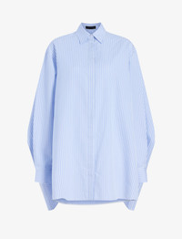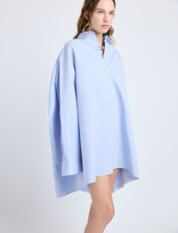 The Isla Dress in Stripe Cotton Silk Poplin features an easy shirt dress silhouette, detailed with a sail cape extension that creates fluid movement throughout. Details - Pale blue multi - Point collar - Long sleeves - Concealed button placket - Cape extension - High-low hem - Relaxed silhouette - 82% cotton, 18% silk - SKU: R2523020SC101462 Size & Fit - Model is 5'9.5'' with 32'' bust / 34'' hips. Wearing size 4 Care - 82% cotton, 18% silk - Dry clean only