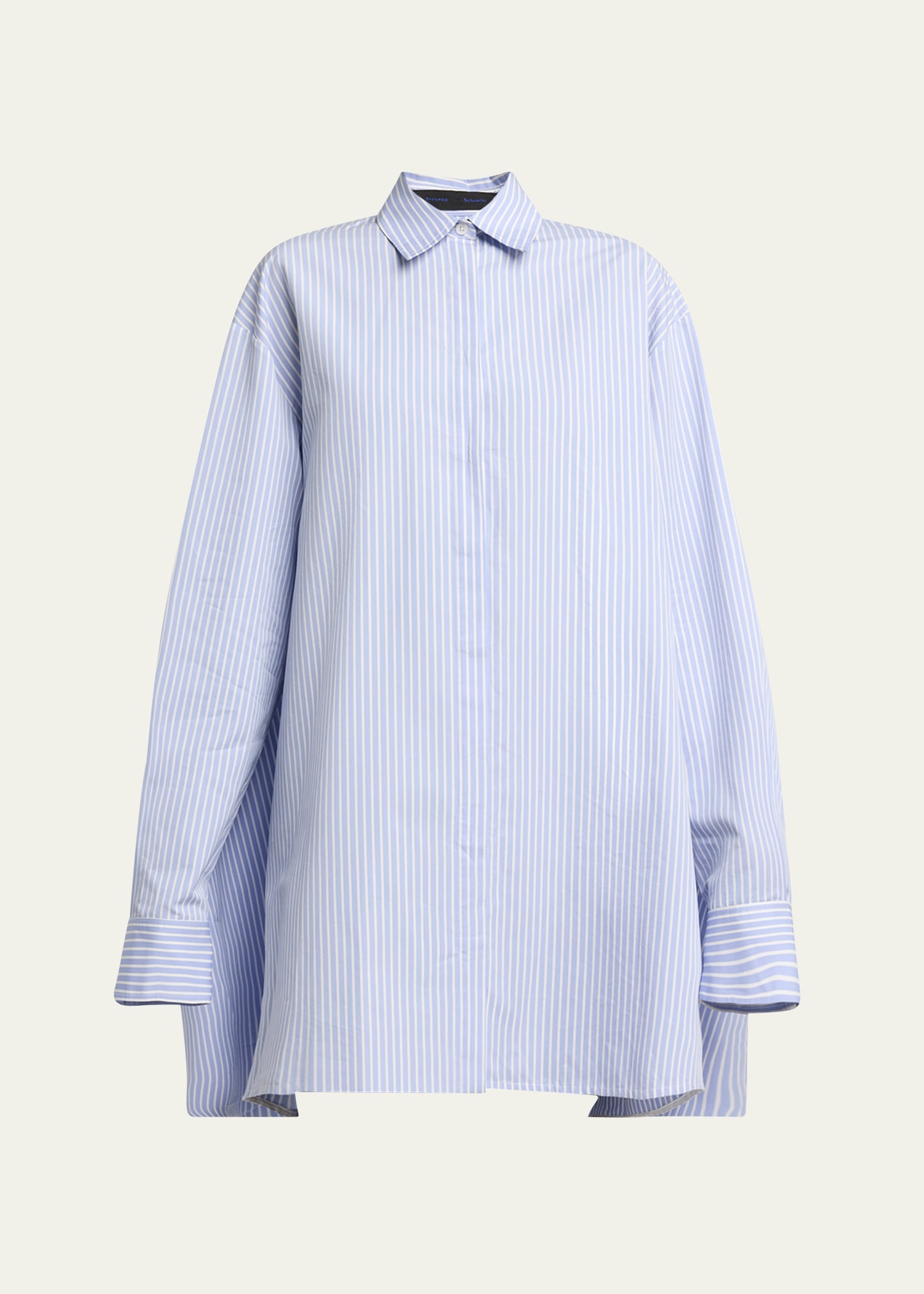 Proenza Schouler "Isla" cotton-silk poplin shirtdress featuring a striped motif and back cape Point collar; concealed button front Long sleeves; button cuffs Shift silhouette Mid-thigh length Cotton/silk/polyester Dry clean Made in Italy Online Inquiries: BGS21_B9UXL| Store Inquiries: #4977493