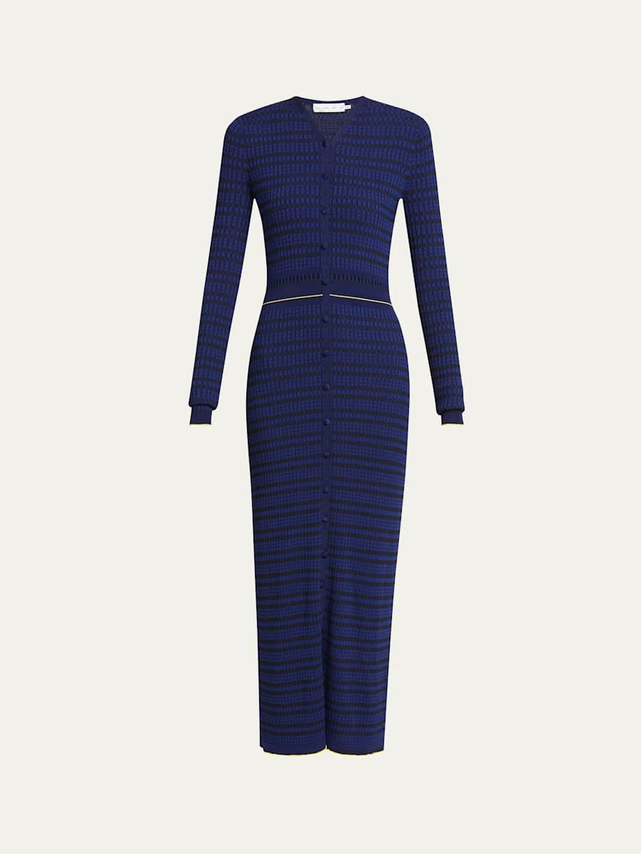 Proenza Schouler PSWL "Ivanna" ribbed midi featuring a microcheck motif V neckline Long sleeves Fitted column silhouette Hem falls below the knee Buttonfront Viscose/nylon/polyamide/elastane Dry clean Imported