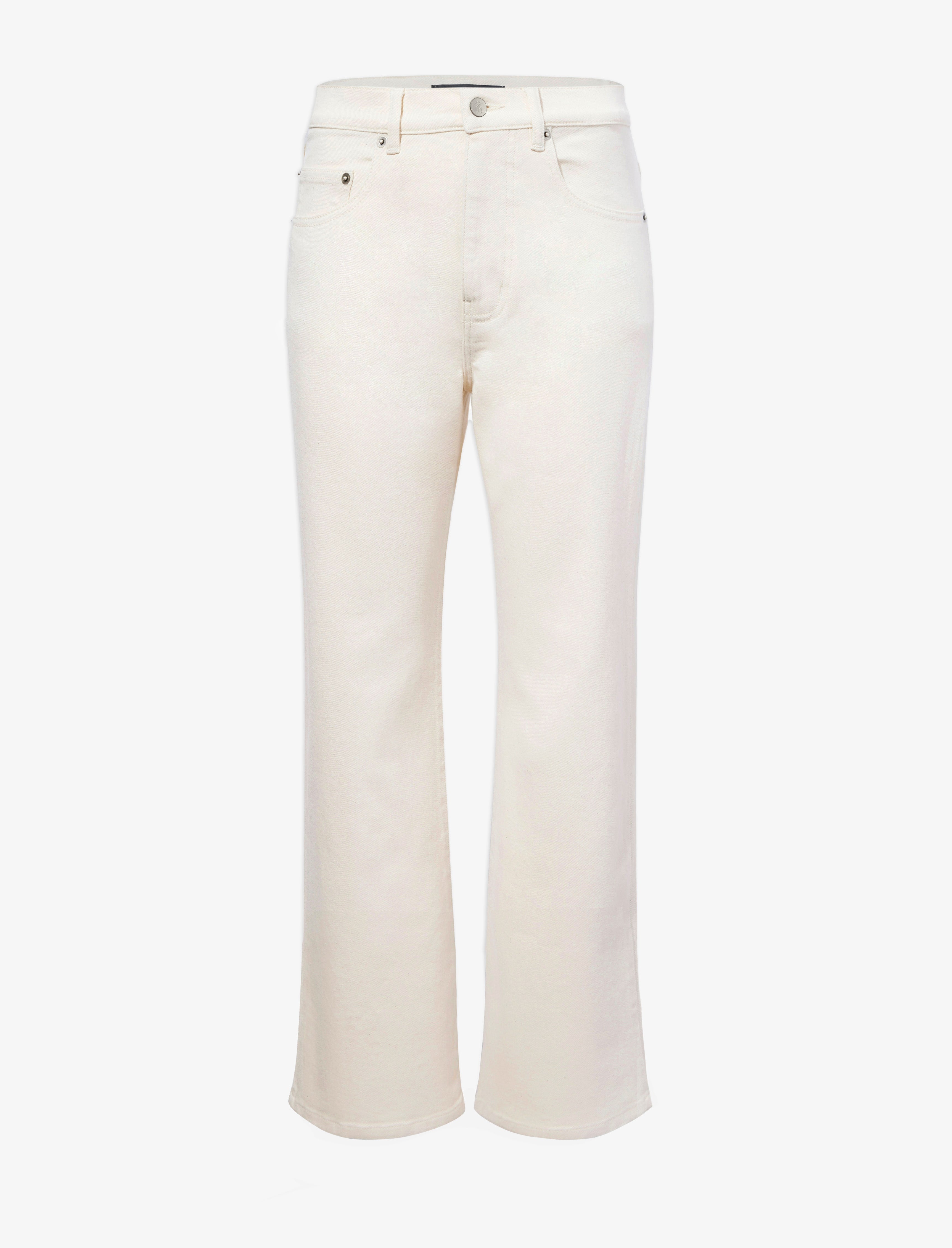 The Jasper Jean is crafted to a high-rise straight silhouette. Designed with stretch and detailed with a monogram front button closure, these jeans are finished with a slight flare at the ankle. Details - Ecru - Stretch denim - High waisted - Monogram button closure - Concealed zip fastening - Straight silhouette - Slight ankle flare - Size 27 inseam measures 29 1/4'' - 98% cotton, 2% elastane - Made in Portugal - SKU: R2428002DC058103 Size & Fit - Model is 5'11'' with 31.5'' bust / 34'' hips. Wearing size 27 Care - 98% cotton, 2% elastane - Dry clean only